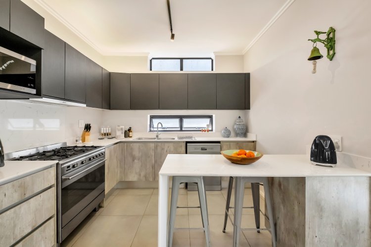 The designer kitchen is both beautiful and practical, featuring Smeg gas hob and oven, space for a double-door fridge, sleek cabinetry and Caesarstone tops that enhances the minimalist design. Every finish has been curated for timeless appeal, ensuring the space feels both modern and warm.