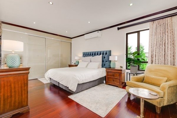 Upstairs, a cozy pyjama lounge with a combustion fireplace sets the tone for family comfort. Two spacious guest bedrooms with air conditioning and built-in cupboards share a full bathroom, while the main suite offers a bio-ethanol fireplace, private balcony, and luxurious full en-suite bathroom.