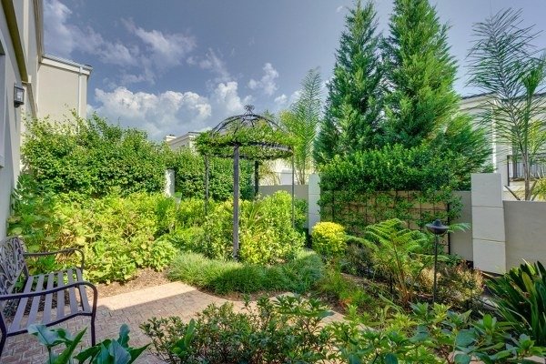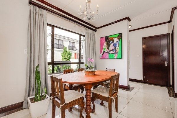 Inside, the open-plan living and dining area is bright and stylish, flowing seamlessly to a covered patio with built-in braai and a wrap-around landscaped garden, perfect for entertaining or relaxing in privacy. The modern kitchen includes a breakfast island, electric stove and oven, extractor fan, and space for two appliances. A guest loo and under-stair storage complete the ground floor.