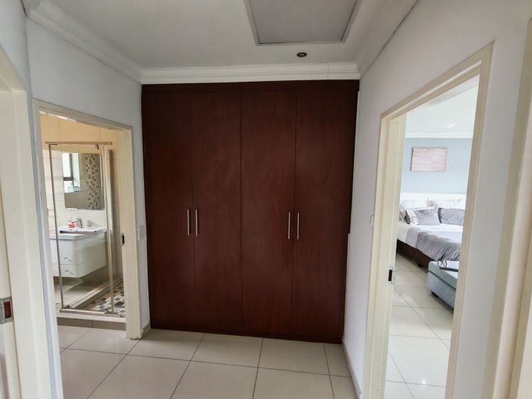The home features three spacious bedrooms with built-in cupboards and two modern, fully tiled bathrooms. The open-plan lounge, complete with a custom-built TV unit, is bright and welcoming and flows effortlessly onto the covered patio.