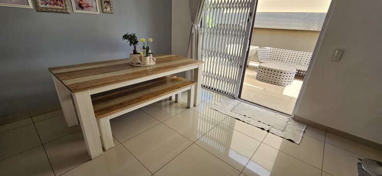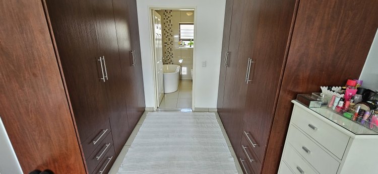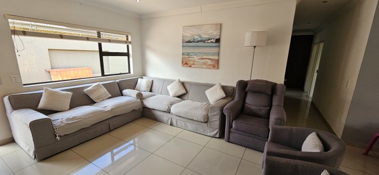 There are 3 very well sized bedrooms with built in cupboards and 2 full bathrooms (MES). Sliding doors from the living area leads out to the covered patio overlooking the private and pet friendly garden with a built in braai. This unit is complete with a double automated garage, pre-paid electricity, a solar geyser, and is well secured with an alarm system, and CCTV.