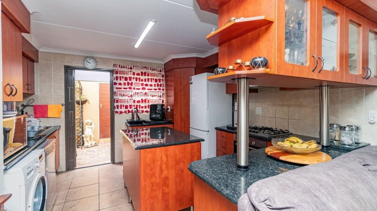 The beautiful, well-appointed kitchen is a standout feature, complete with a gas hob, electric oven, and quality finishes – perfect for everyday cooking and entertaining. A solar geyser adds energy efficiency and cost savings.