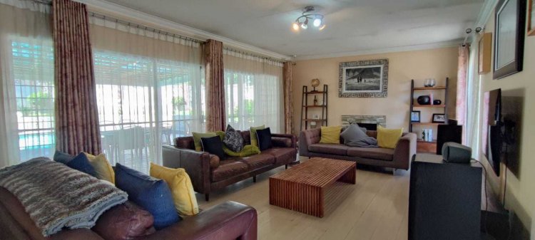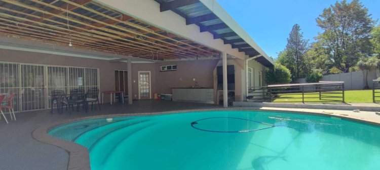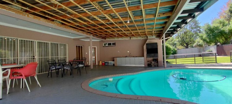 The main living areas are open-plan, with a spacious lounge and dining area that flow effortlessly together. French doors open to a covered patio with a built-in braai, overlooking the swimming pool and entertainment area, perfect for hosting family and friends.