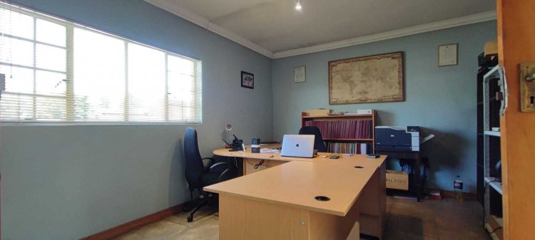 The large, fitted kitchen is both practical and inviting, offering ample cupboard space, a center island, and excellent natural light. Adjacent to the kitchen is a generous multi-purpose room currently used as a study, ideal as a scullery, hobby room, or even a fourth bedroom depending on your needs.