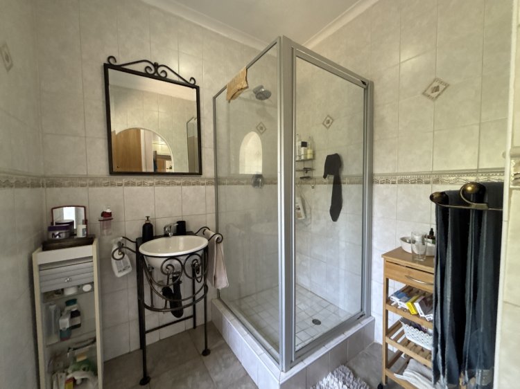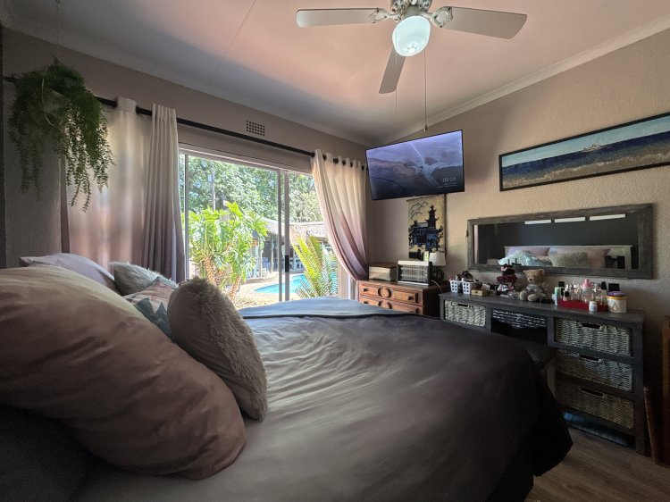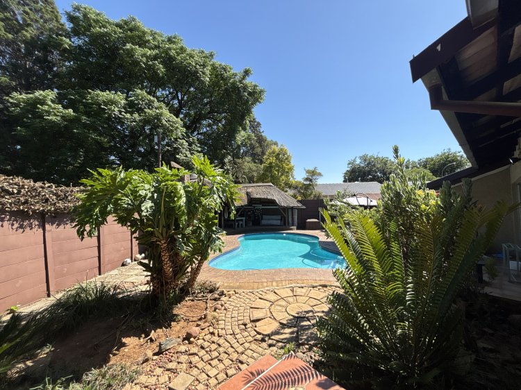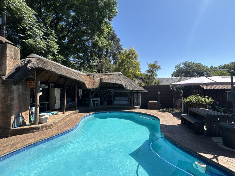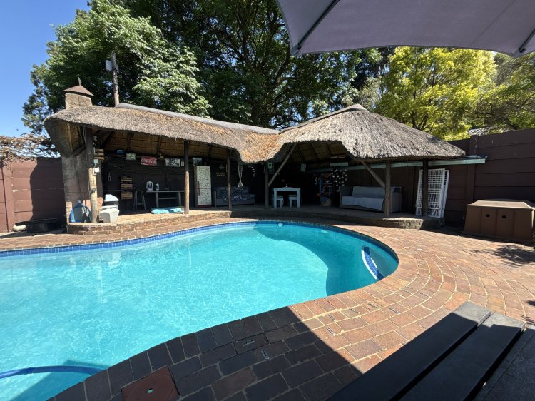 The entertainment area is a true highlight — featuring a thatched lapa with a built-in braai that overlooks a sparkling swimming pool, ideal for family gatherings and weekend braais.