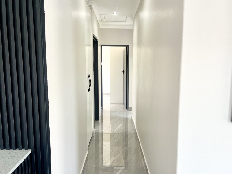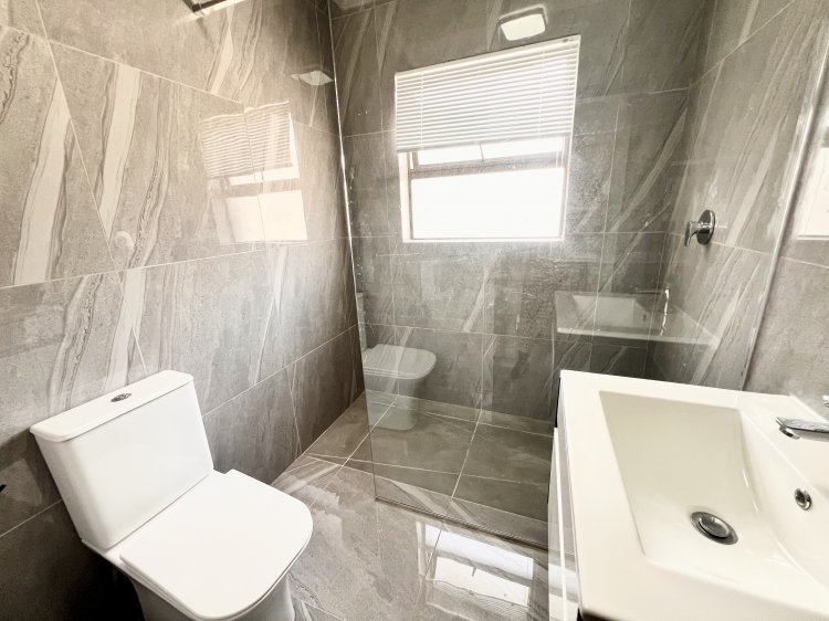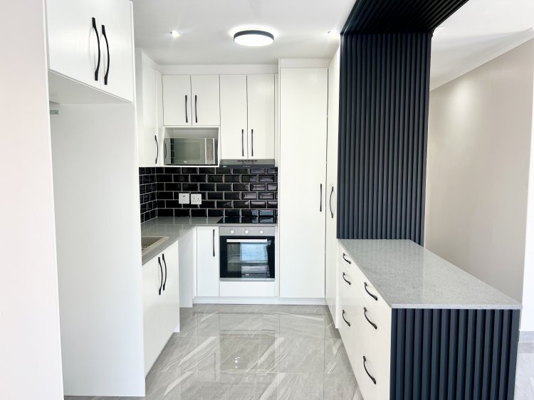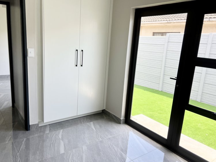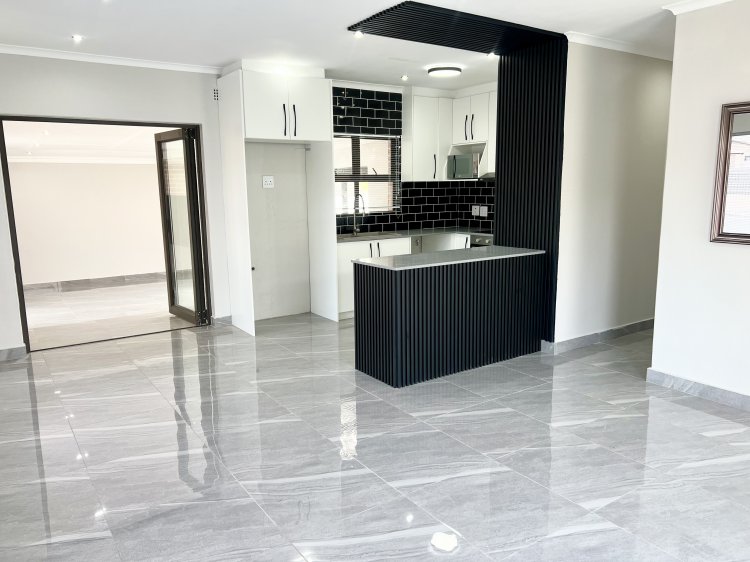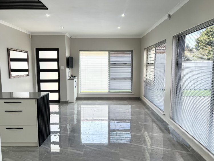 The spacious open-plan lounge and dining area flow seamlessly into a fully fitted kitchen with granite countertops, creating a practical and stylish space for everyday living and entertaining. Downlighters throughout enhance the modern, clean lines of the home. An impressive entertainment area forms the heart of the property, featuring an indoor braai and stack doors that open onto the back garden—perfect for relaxed gatherings and year-round enjoyment.