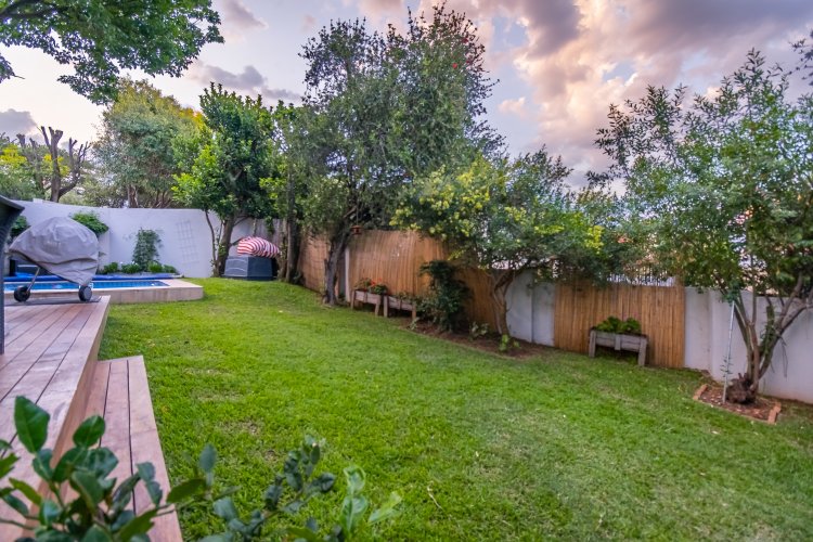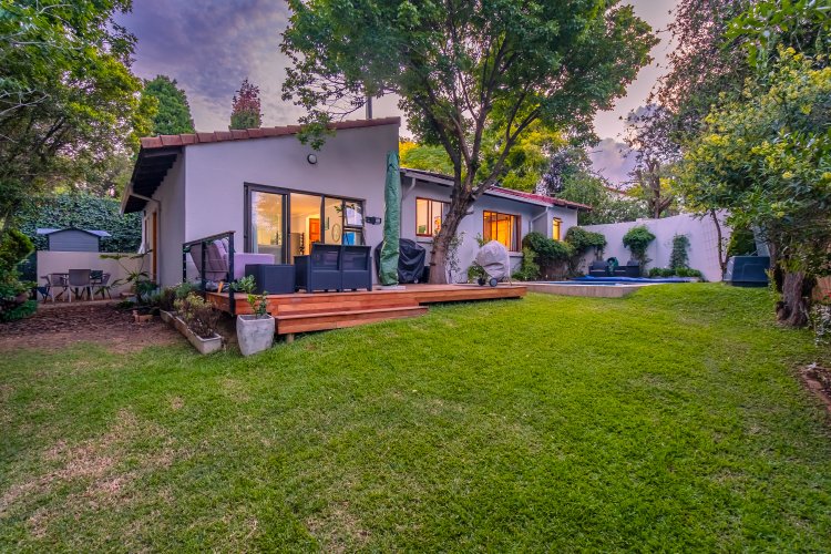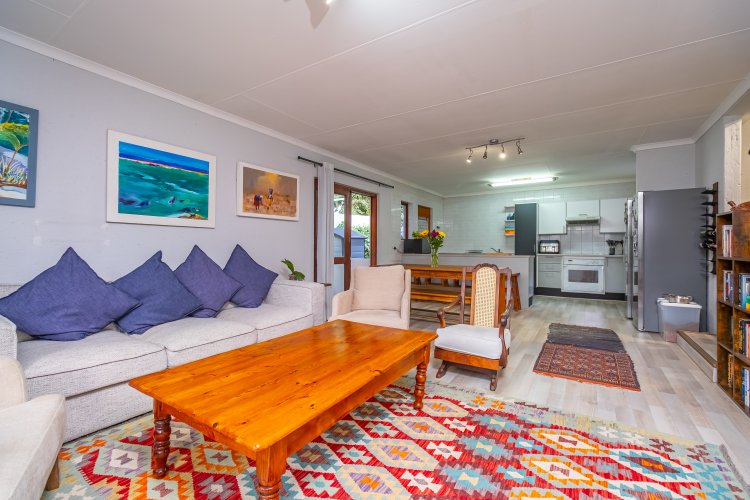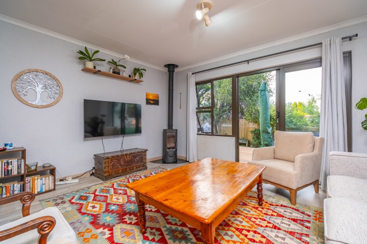 The kitchen, ready for renovation, flows seamlessly into the dining area and lounge with fireplace. Living room opens onto a wooden deck overlooking a lush green garden and sparkling pool — perfect for relaxed living and entertaining.