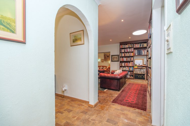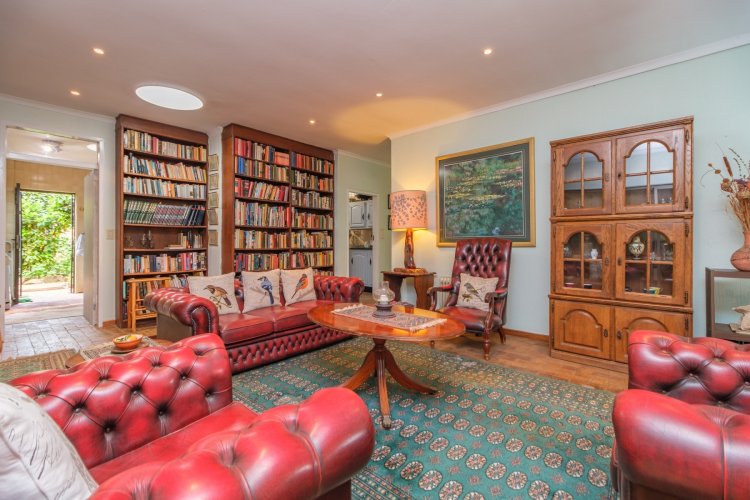 3 separate lounges: One featuring a floor-to-ceiling bookcase Another with views of the garden and swimming pool