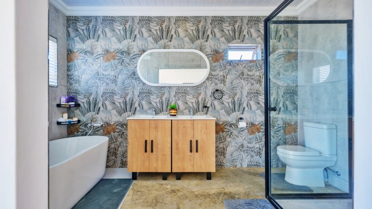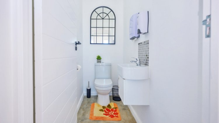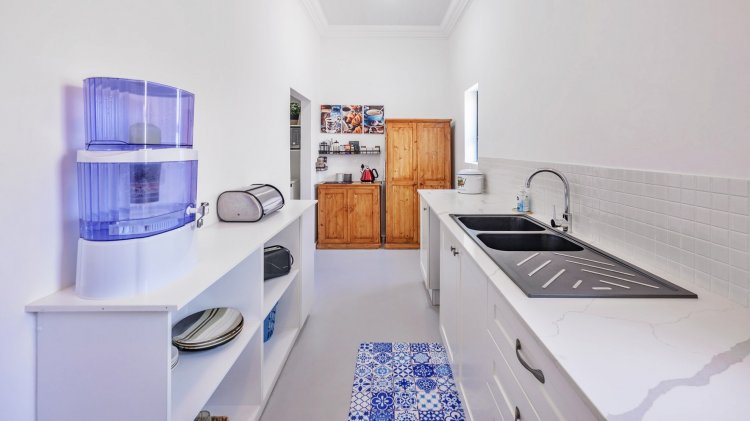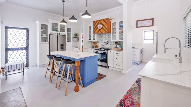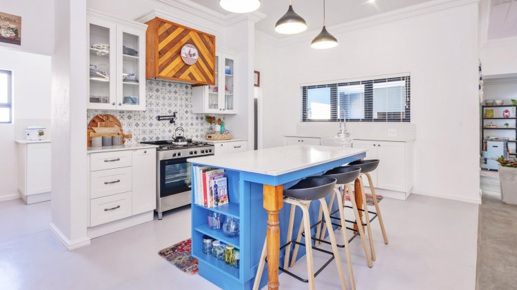 Entry is through a striking artistic blue front door into a spacious entrance hall. The ground floor offers a well-sized bedroom with a en-suite bathroom, along with a separate guest bathroom. The open-plan living and dining areas connect seamlessly to a modern, well-appointed kitchen designed for both everyday use and entertaining. Kitchen features include white granite countertops, a butler sink, a blue centre island, and a freestanding gas stove with electric oven, which is included in the sale. Installed above the stove is a unique pot filler tap, providing added ease and convenience while cooking. Also included in the sale are the double-door fridge, microwave, and two loose-standing wooden cupboards located in the scullery. A dedicated coffee station and a separate scullery with ample storage further enhance the kitchen’s practicality.
