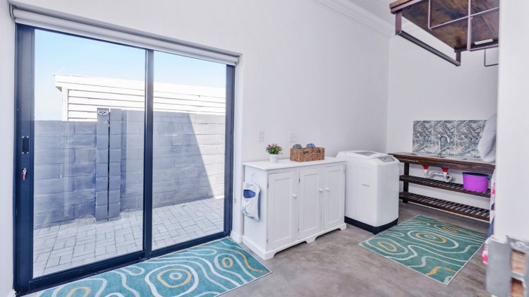 The adjacent laundry room is fitted with a double basin and a built-in ironing board, making daily laundry tasks efficient and convenient. From here, access is provided to a private courtyard. The expansive living area opens onto a covered braai patio overlooking a neatly maintained garden, creating an inviting space for entertaining and family gatherings. Modern light fittings and quality architectural finishes are evident throughout the home.