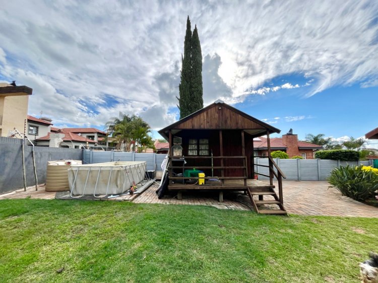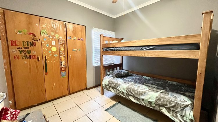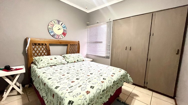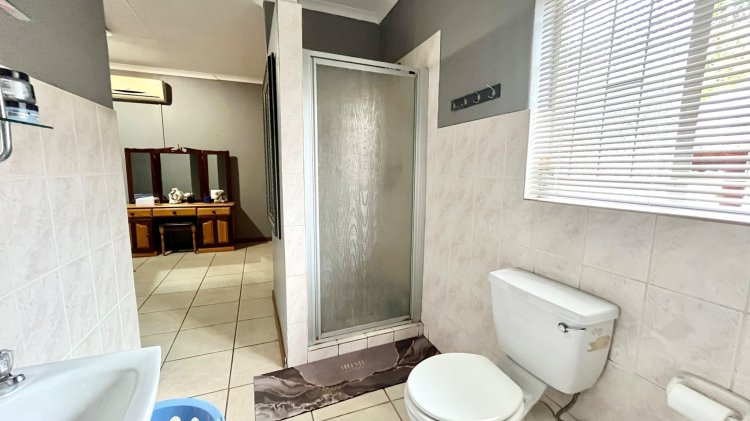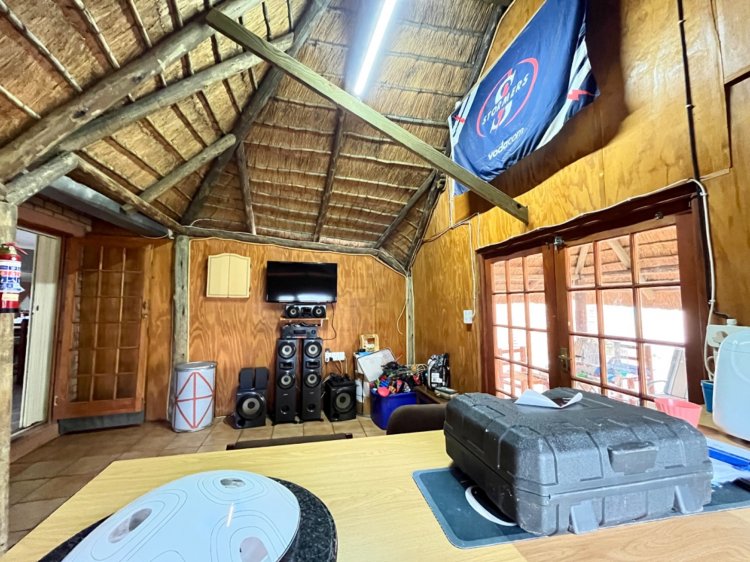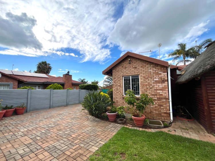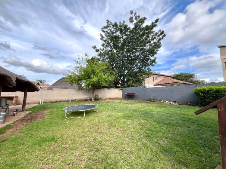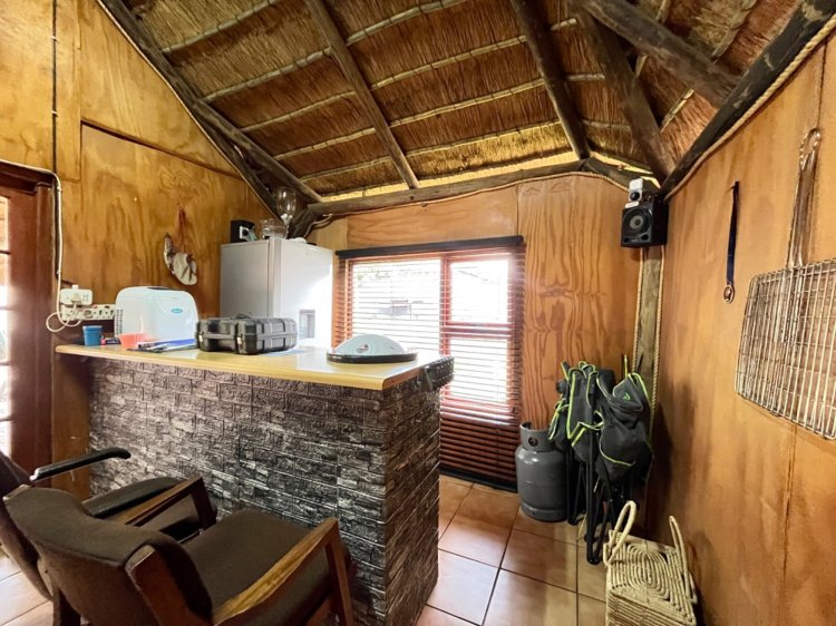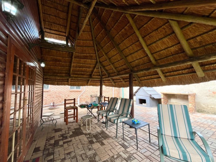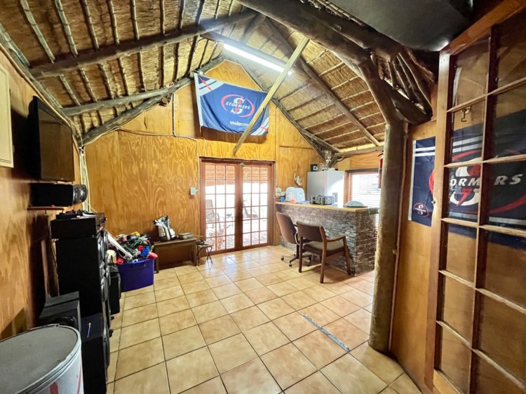 Designed for under cover entertaining, the home boasts a charming thatched lapa accessed from the dining area, featuring a corner bar and ample space for hosting family and friends. The thatch continues outdoors, creating a shaded patio area overlooking the garden.