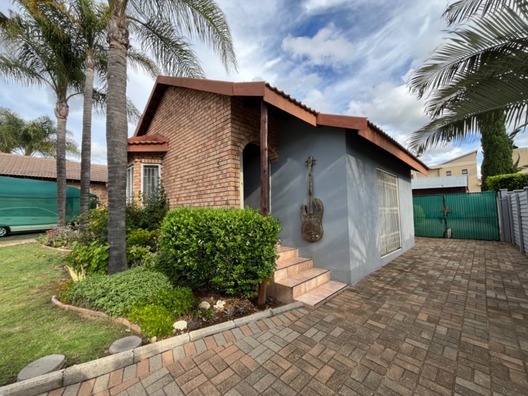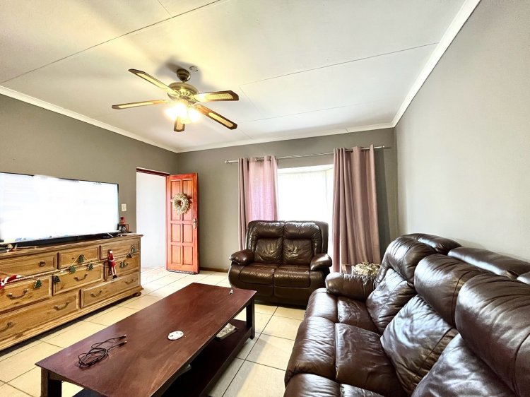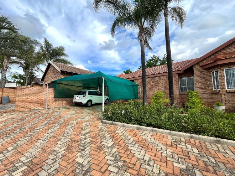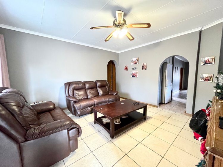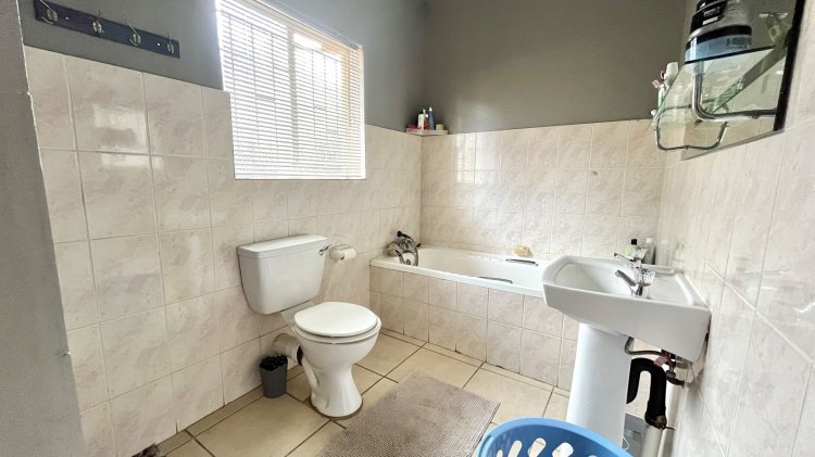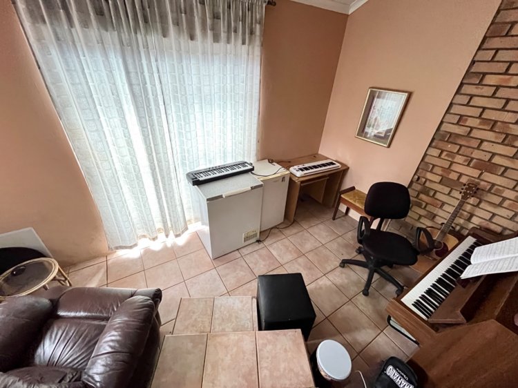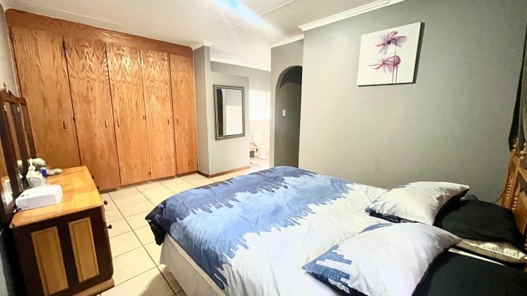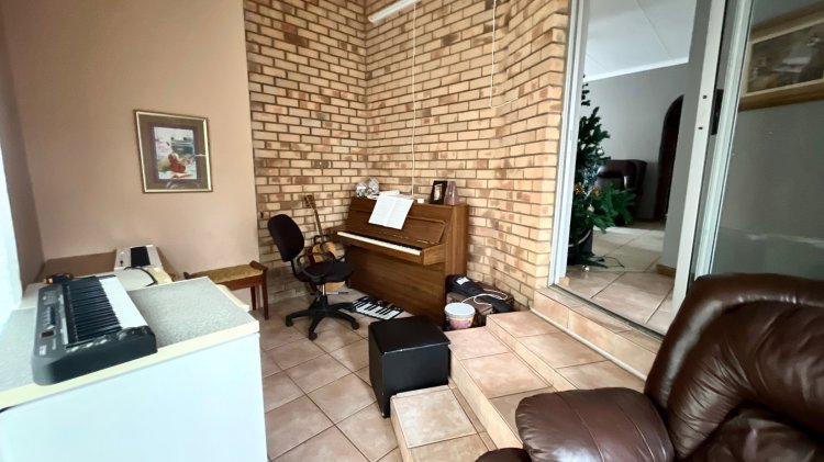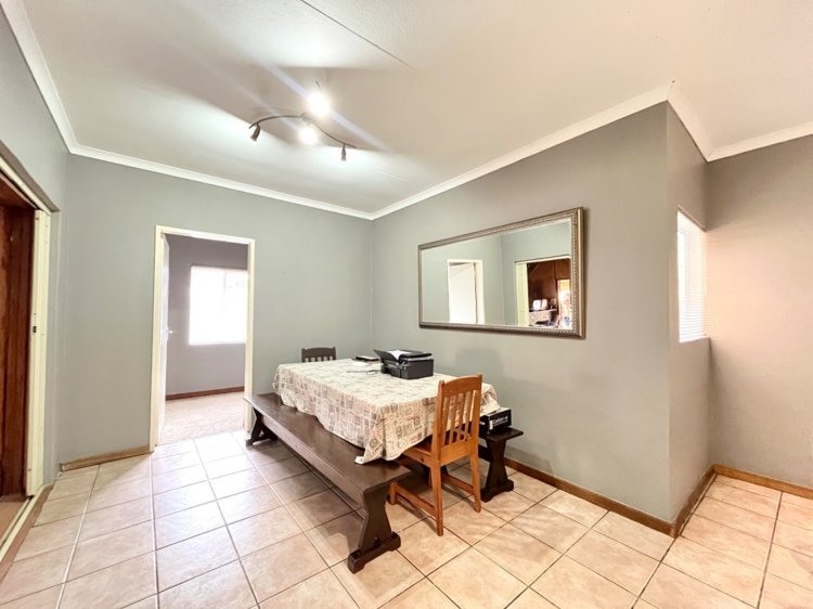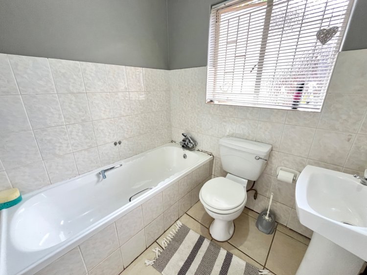 Designed for under cover entertaining, the home boasts a charming thatched lapa accessed from the dining area, featuring a corner bar and ample space for hosting family and friends. The thatch continues outdoors, creating a shaded patio area overlooking the garden.