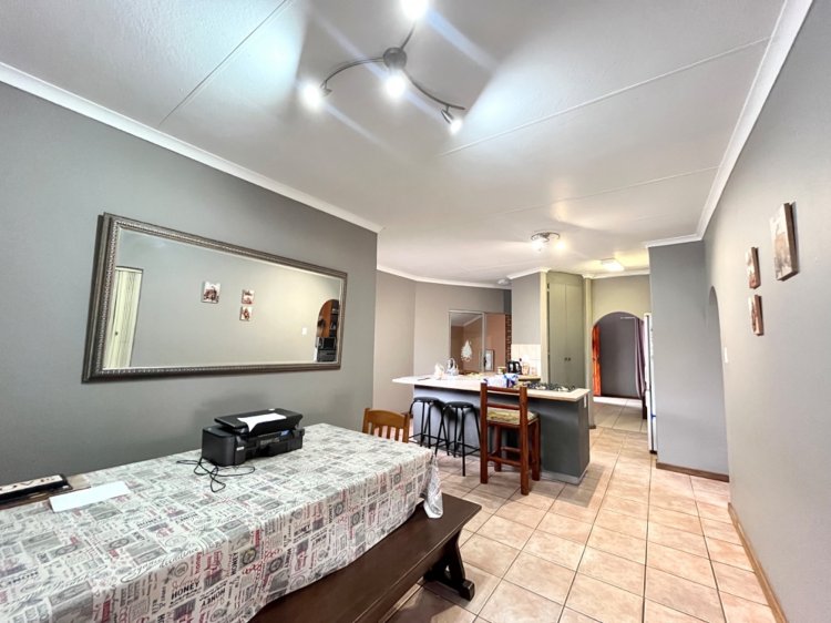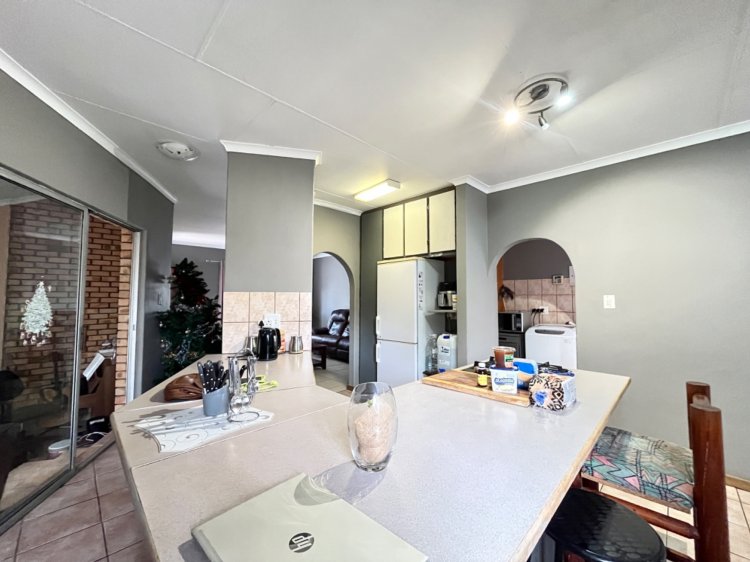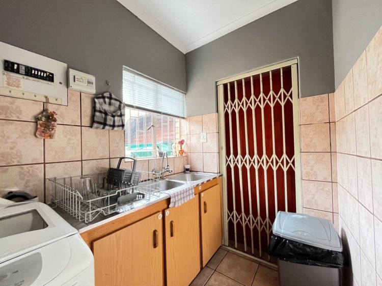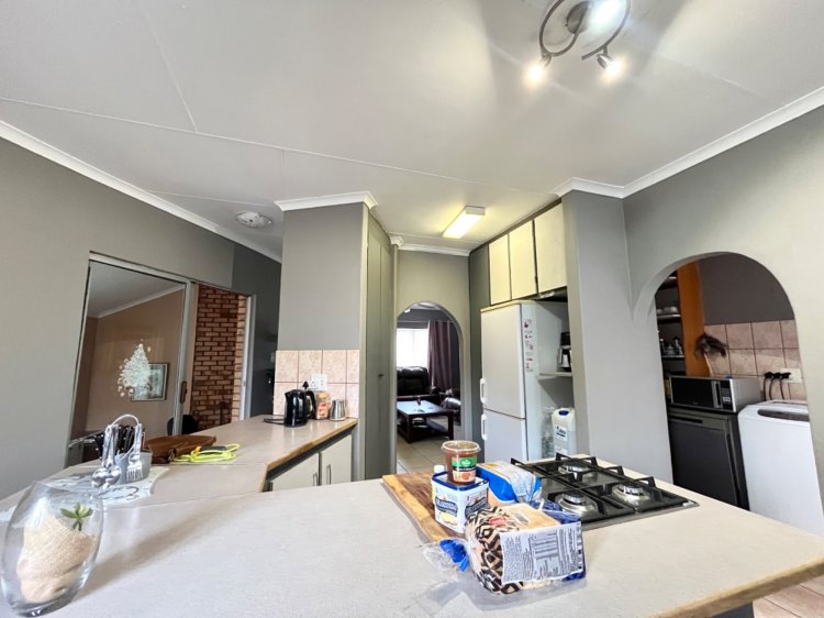 Flowing through an elegant arched doorway, the home opens into a large open-plan kitchen fitted with a gas stove, a breakfast bar, and ample workspace. The open-plan layout to the dining area allows for easy family interaction — whether you're preparing meals, spending time together, or keeping an eye on children while they do their homework. To the left, the kitchen offers a separate scullery with a double sink, space for a washing machine, and a walk-in pantry, ensuring both practicality and generous storage.