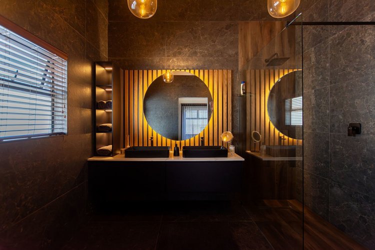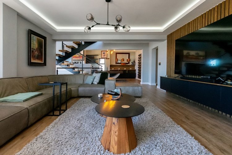 On the lower level, a formal lounge opens onto a covered patio fitted with an electric awning, allowing for sheltered outdoor living throughout the year. Adjacent to the main entrance, a glass-enclosed home office provides a dedicated workspace that is both functional and discreet, ideal for remote or professional use.