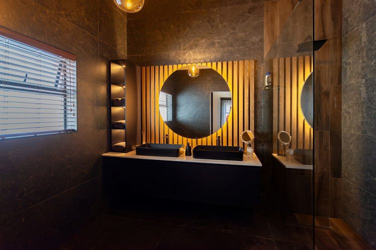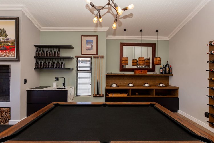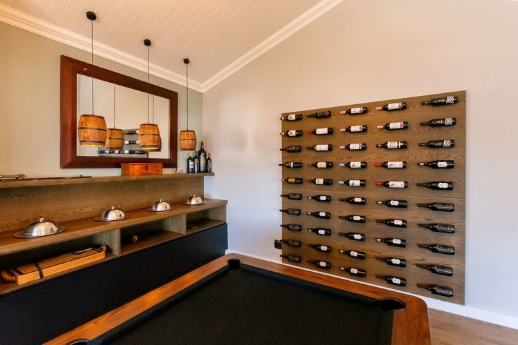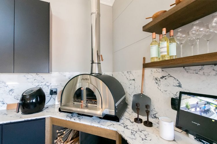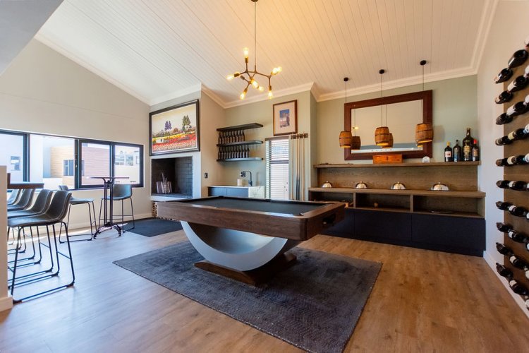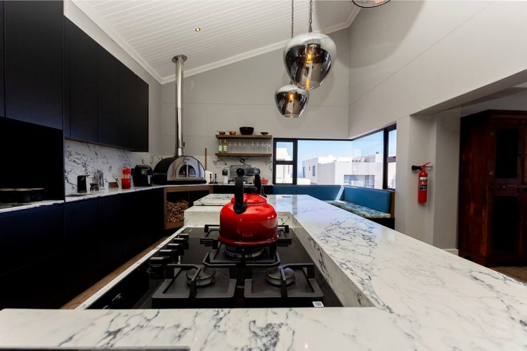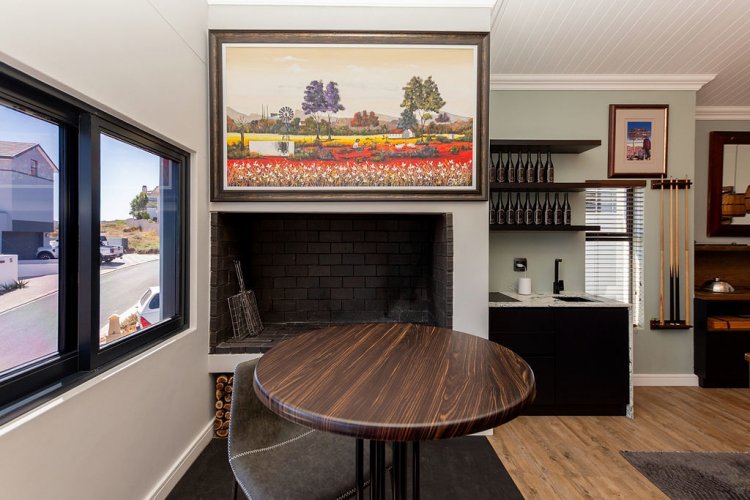 The open-plan kitchen occupies a central position within the home and is finished with quartz countertops and a separate scullery. Designed for both everyday living and entertaining, it includes a built-in coffee machine, pizza oven, wine fridge, glass display cabinetry, and dedicated under-counter wine glass storage. From here, the kitchen flows seamlessly into the dining and main living areas, where a built-in indoor braai is positioned to integrate naturally with the space.