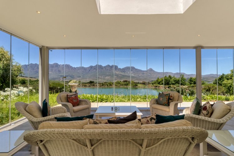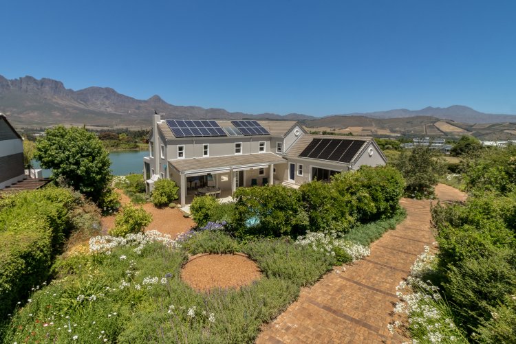 Set on the water’s edge within the prestigious Erinvale Golf Estate, this exceptional home captures a rare combination of dam frontage, sweeping sea views, and dramatic mountain backdrops, creating a setting that is both visually striking and deeply calming.