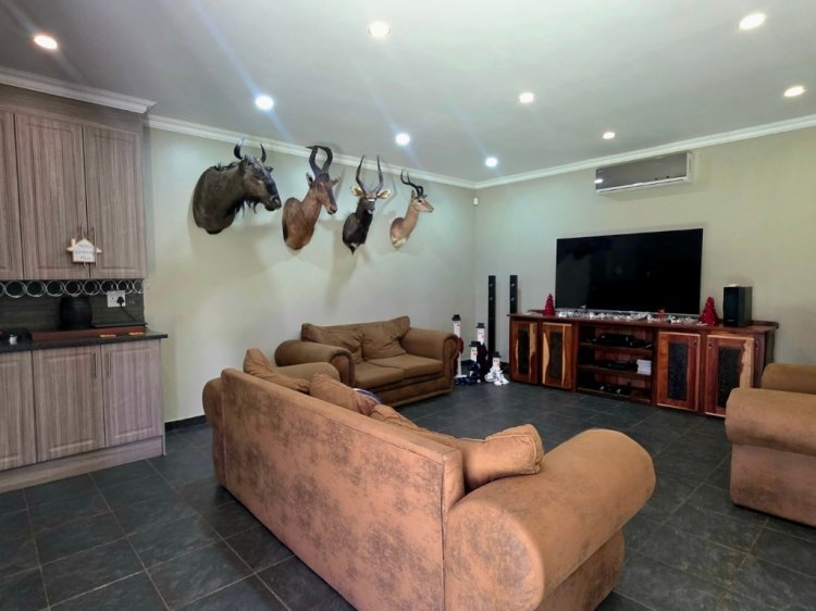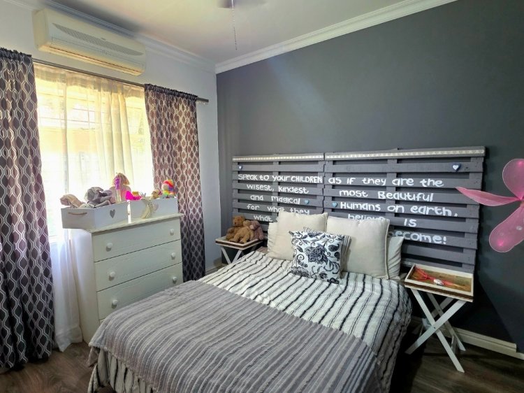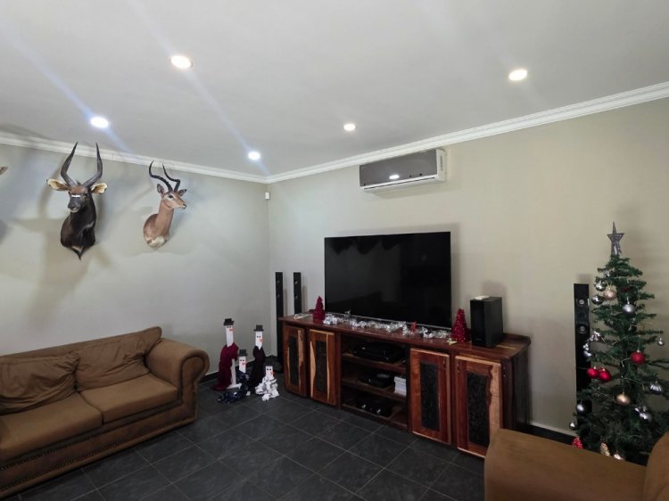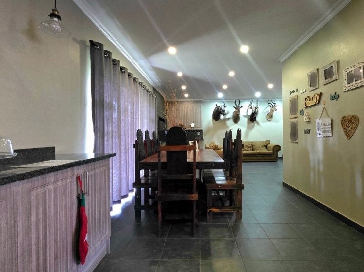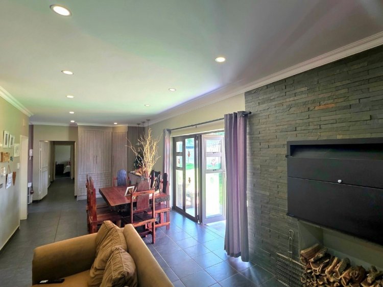 PROPERTY HIGHLIGHTS • 3 Bedrooms, each fitted with an aircon • 2 Bathrooms (main bedroom with en-suite) • Safety gate separating bedrooms from the rest of the home • Beautiful kitchen with granite countertops and a separate scullery • Large study room – ideal for work from home or can easily become a 4th bedroom • Dining area and open-plan lounge, complete with aircon • Built-in mini bar and built-in braai • Stacking doors opening onto a lush green lawn • Covered stoep overlooking garden • Lovely boma area perfect for outdoor gatherings • Double garage plus covered carport for up to 4 vehicles • Remote-controlled access gate plus a second gate for convenience