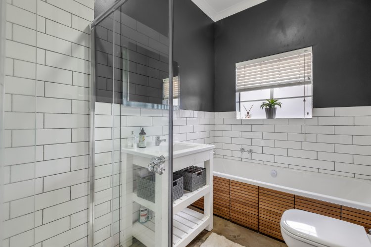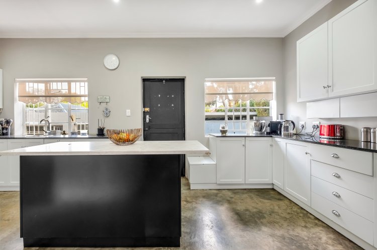 Inside, the home’s palette is timeless — dark wooden floors meet polished concrete in all the right places, and high ceilings enhance the sense of volume and space. The entrance hall leads naturally into the dining room, which flows through to a modern open-plan kitchen complete with a secluded scullery. A spacious living room with a charming bay window overlooks the garden, inviting in light and tranquillity.