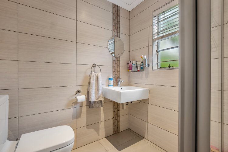 All three bedrooms are privately positioned on one side of the home. The main suite offers a contemporary en-suite bathroom and generous built-in cupboards, while the remaining bathrooms have been tastefully modernized.