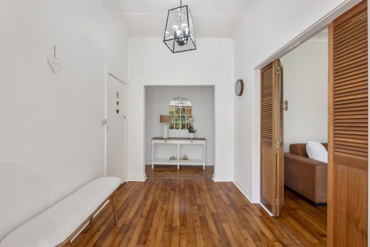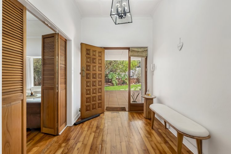 The covered patio, framed by leafy views of the garden, is the perfect setting for relaxed weekend breakfasts or long summer lunches by the pool. From here, the solid front door opens into an inviting entrance hall — a space that gently divides the living areas from the bedroom wing, ensuring both flow and privacy.
