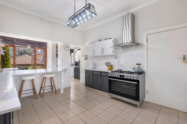 To the right, a sun-filled lounge with large picture windows frames the garden like a living artwork. A wood fireplace anchors the room, creating a sense of warmth and comfort. Adjacent to the lounge, the dining room offers space for both family gatherings and elegant dinners, seamlessly connecting to a spacious kitchen. Here, a generous breakfast nook invites casual moments, while the separate scullery and laundry area keep day-to-day living effortlessly organised.