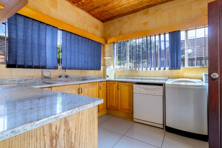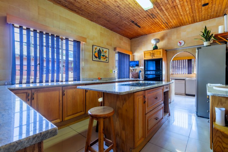The home features: 3 Spacious bedrooms – All with natural light and build in cupboards. 2 Open plan spacious living areas – with one having a bar. Ideal for entertaining friends or relaxing. Tiled entrance hall. A modern tiled kitchen with granite tops, middle island with a Smeg gas hob, eye level oven and ample cupboard space. Separate tiled scullery – Space for 3 appliances.