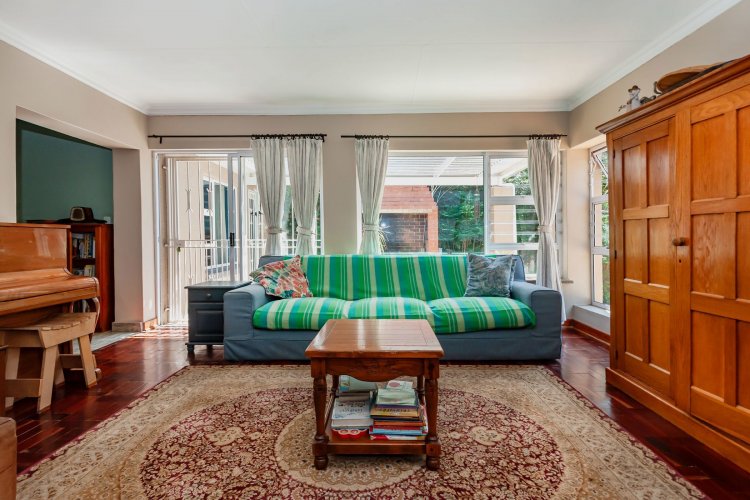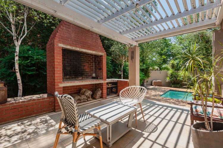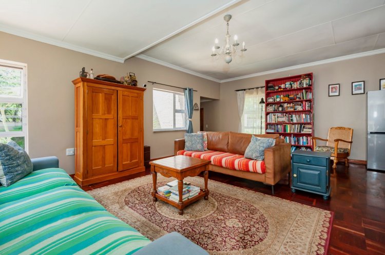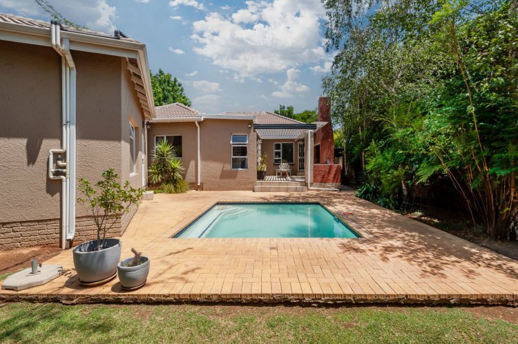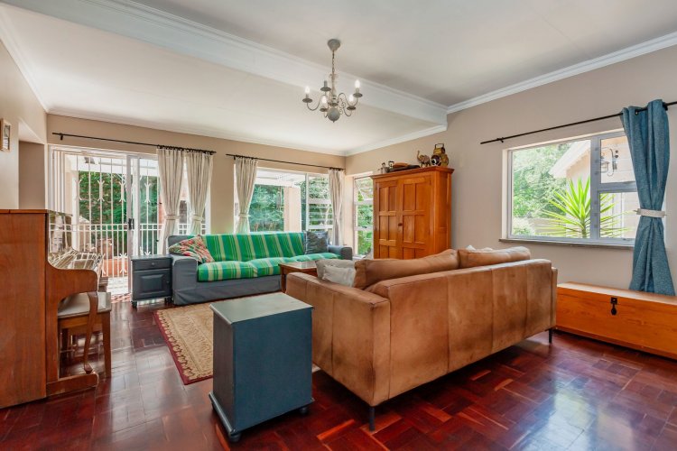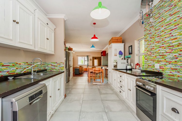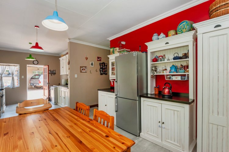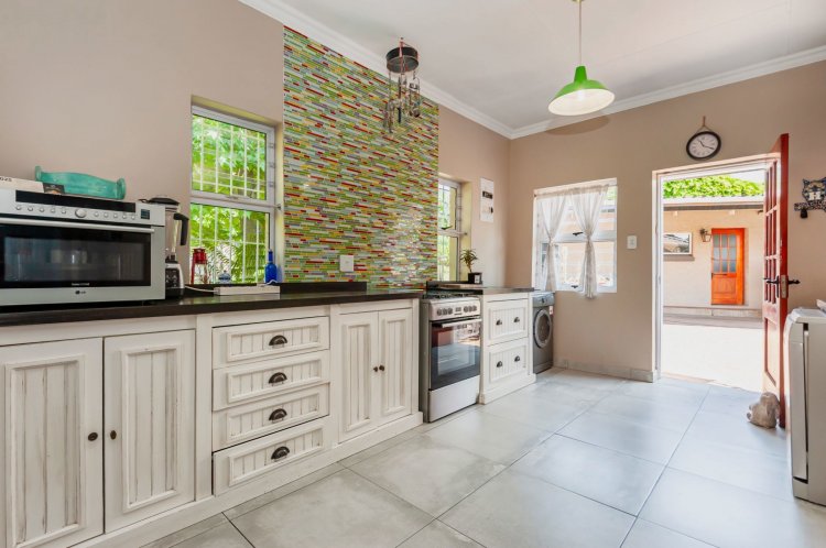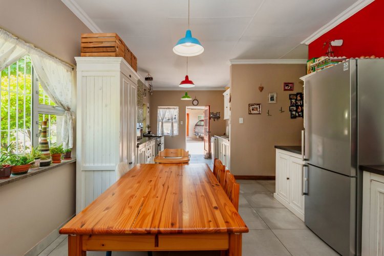 The home offers an inviting lounge area with timeless parquet floors, leading out to a covered braai area overlooking a glistening, solar heated pool. Farm style kitchen from Milestone Kitchens and dining room area with tiled floors, ideal for family meals and gatherings, featuring free-standing kitchen units for maximum versatility.