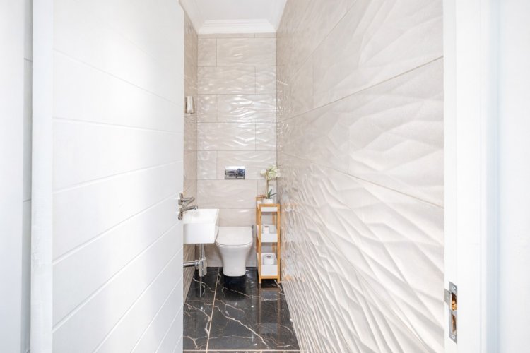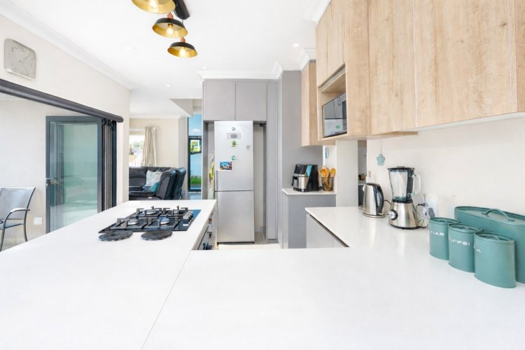 The spacious living areas flow effortlessly into a sleek, contemporary kitchen, complete with a convenient scullery and a guest toilet downstairs.