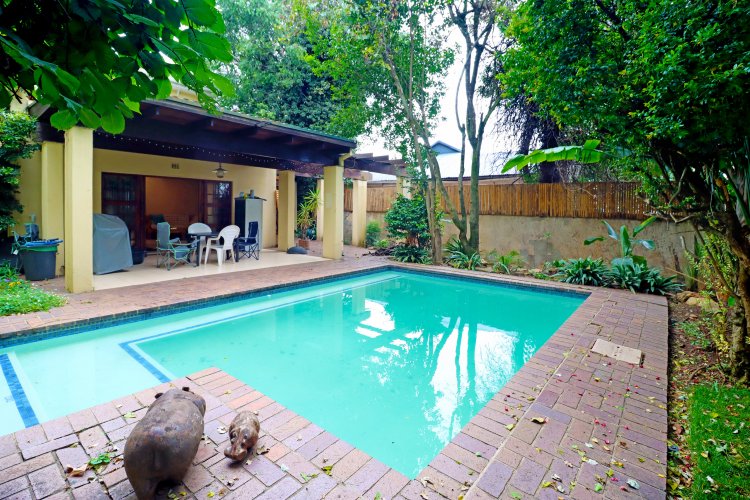 A lush, well-maintained garden surrounds a sparkling blue swimming pool—your private sanctuary for those hot summer days.