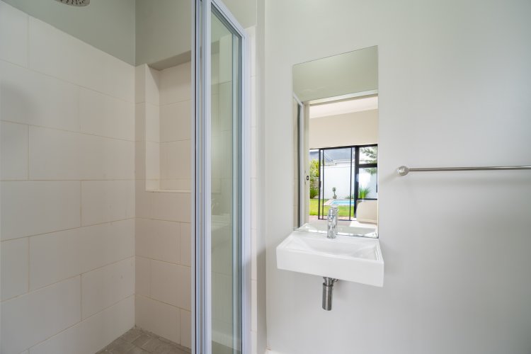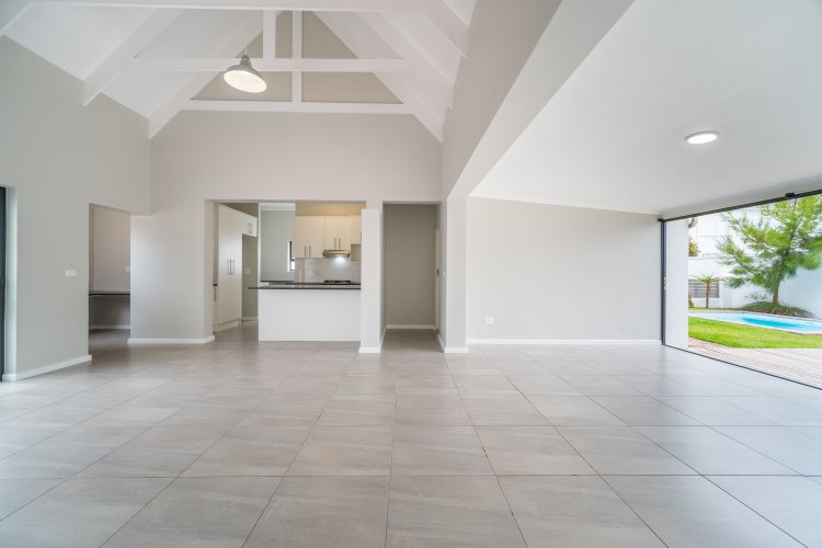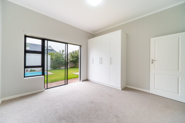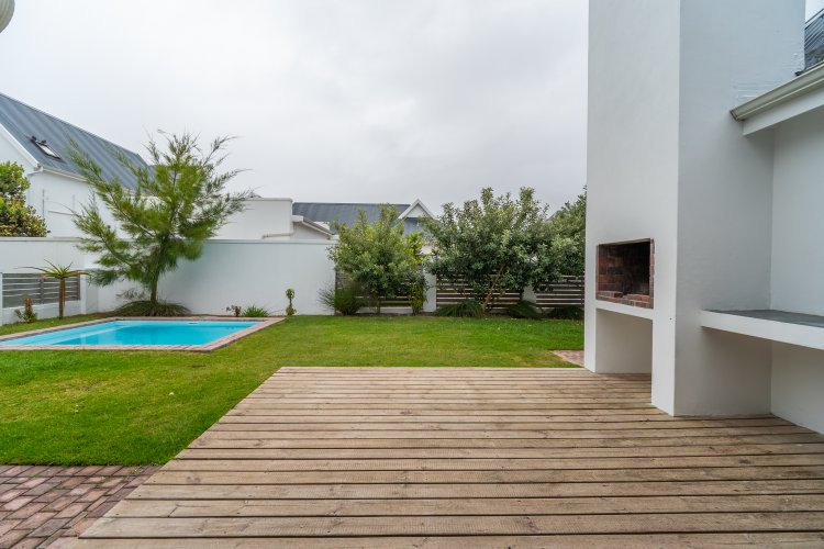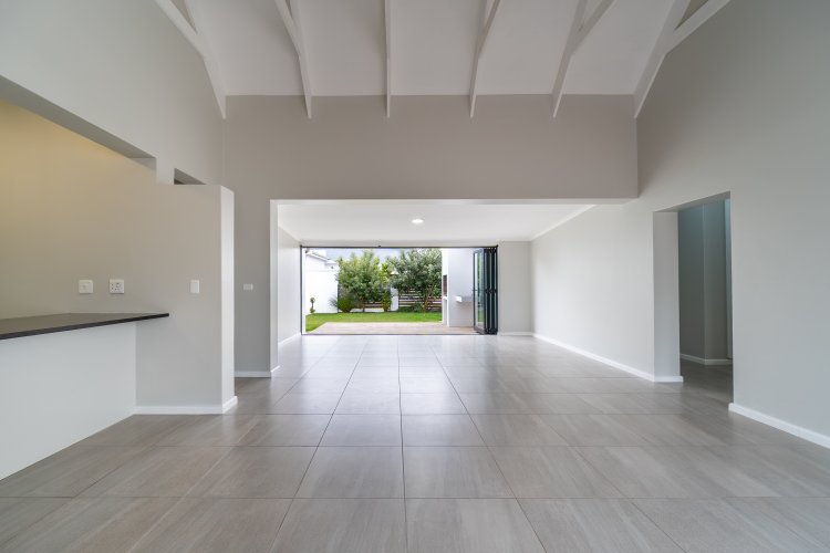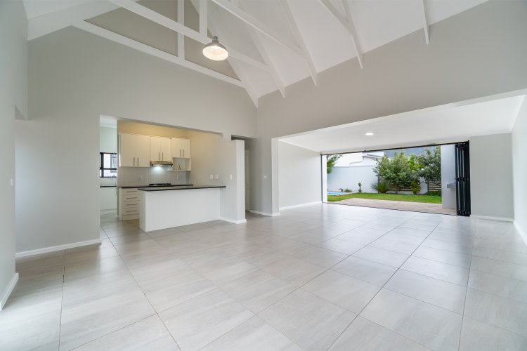 At the heart of the home is an expansive double-volume, open-plan living area that flows effortlessly through stacking doors onto a north-facing, level and established garden. This seamless indoor-outdoor connection creates an ideal setting for relaxed, everyday living and entertaining. The outdoor entertainment space is a true highlight, featuring a built-in braai and sparkling pool—the epitome of South African living and the perfect backdrop for time spent with family and friends.