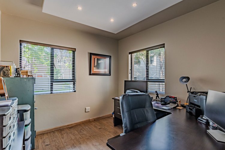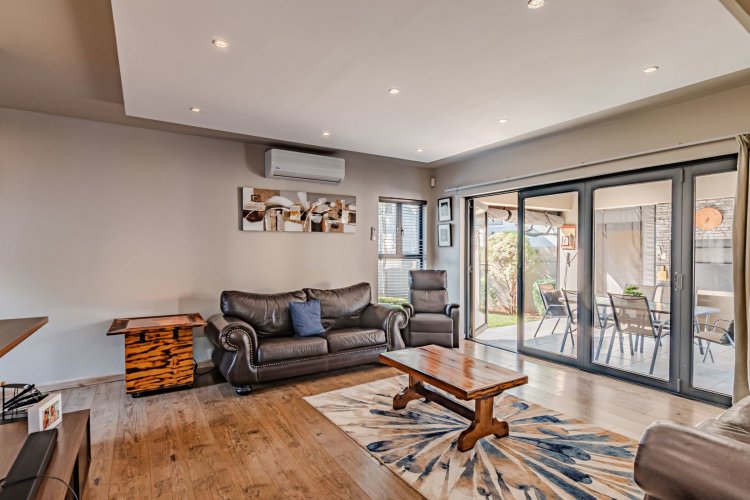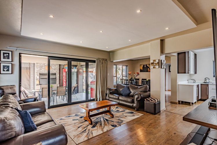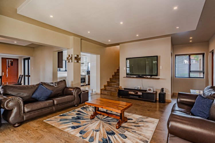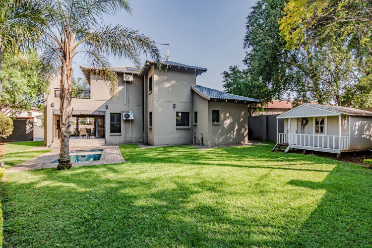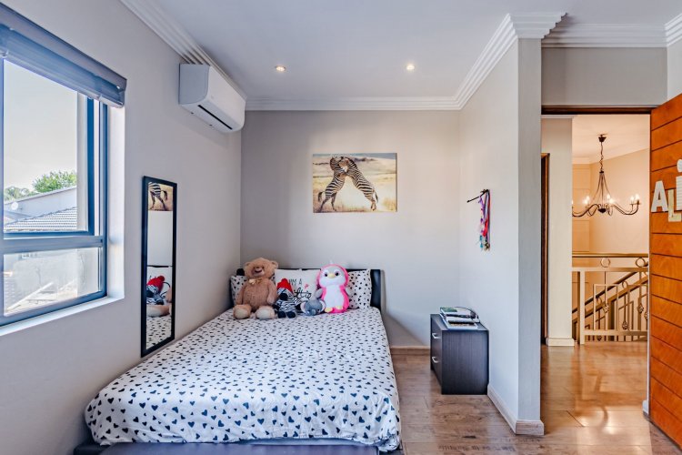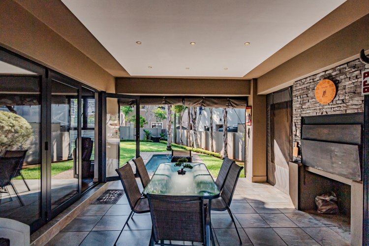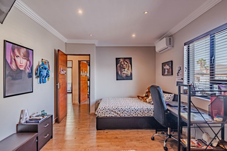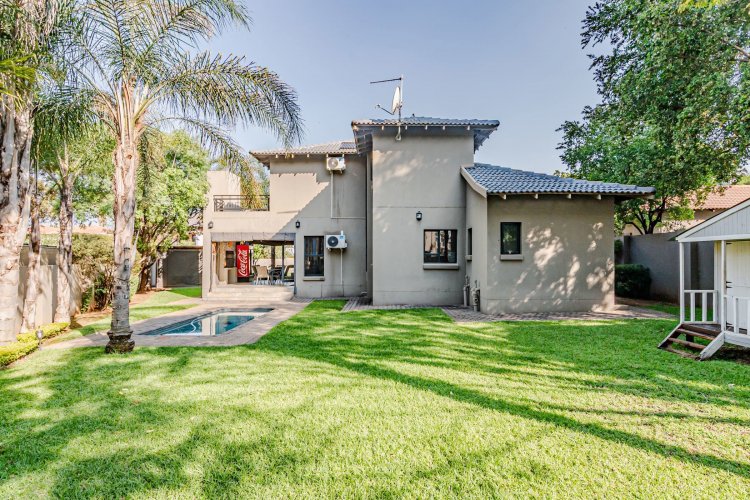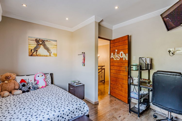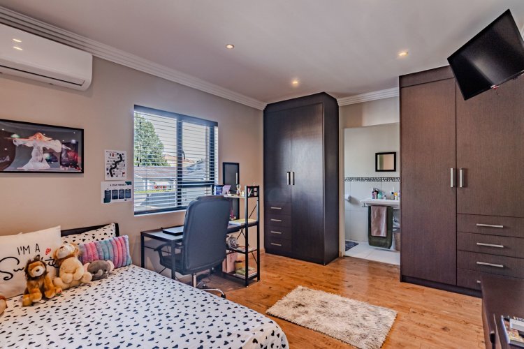 Exclusively presented. Tucked away in a peaceful corner, this immaculate home offers comfort, space, and a wonderful family lifestyle on a generous stand. The ground floor features open-plan living areas that flow seamlessly to the covered patio and sparkling pool — the perfect spot for relaxed entertaining around the built-in braai. The modern kitchen is beautifully finished and practical, complemented by scullery. A private study and guest bathroom complete the bottom floor of this neat family home. Upstairs, you'll find three spacious bedrooms, all en-suite and fitted with air conditioners for year-round comfort. The property also includes a separate helper's room with its own bathroom and a charming dollhouse that will delight the kids. Extras include extra size double garage, a storeroom and back-up solar.