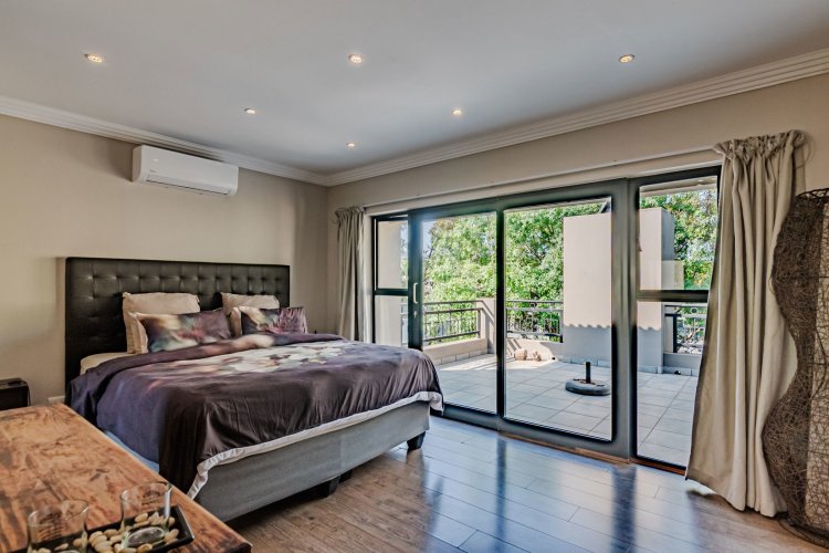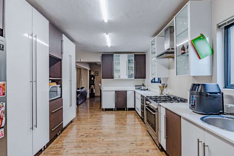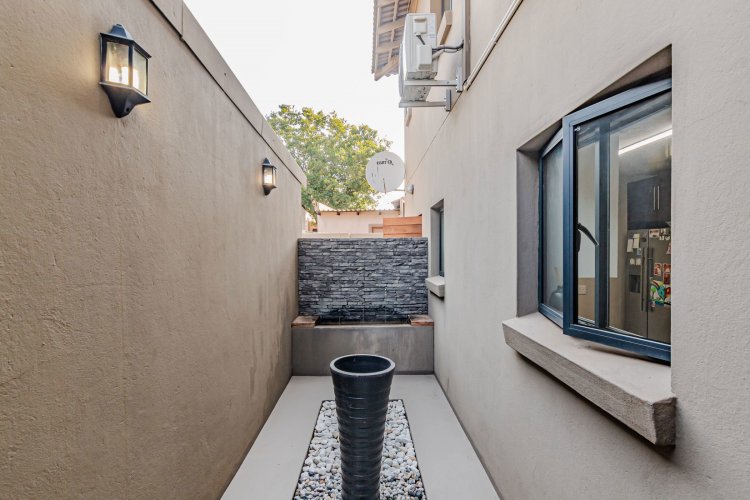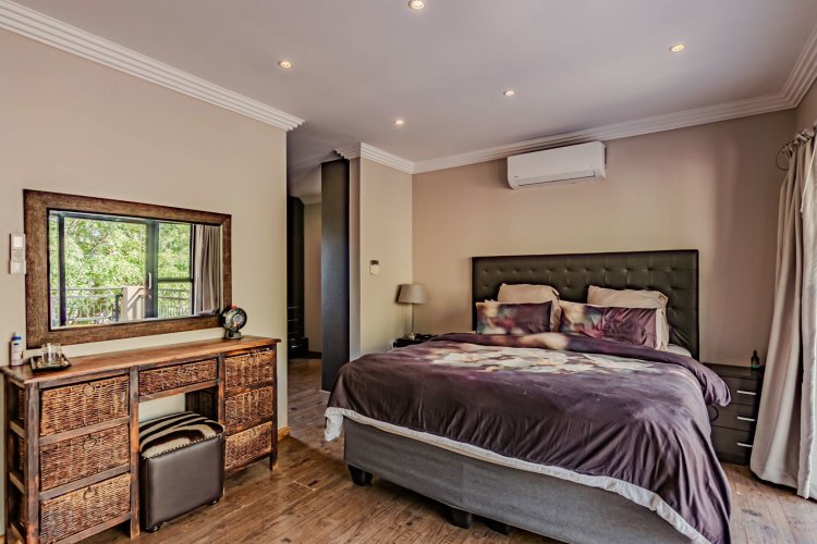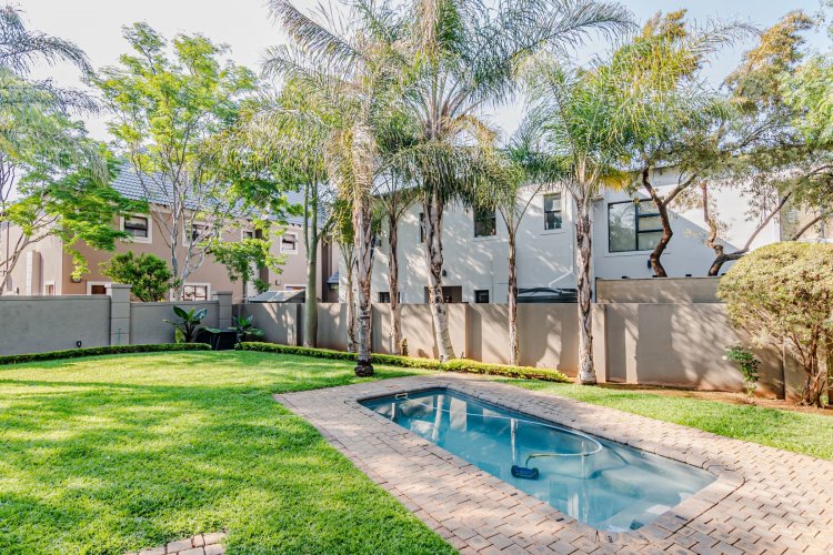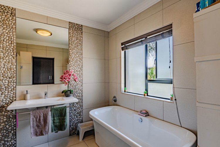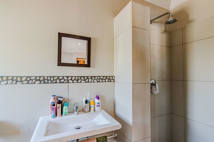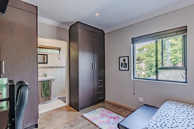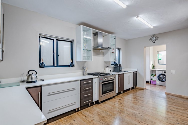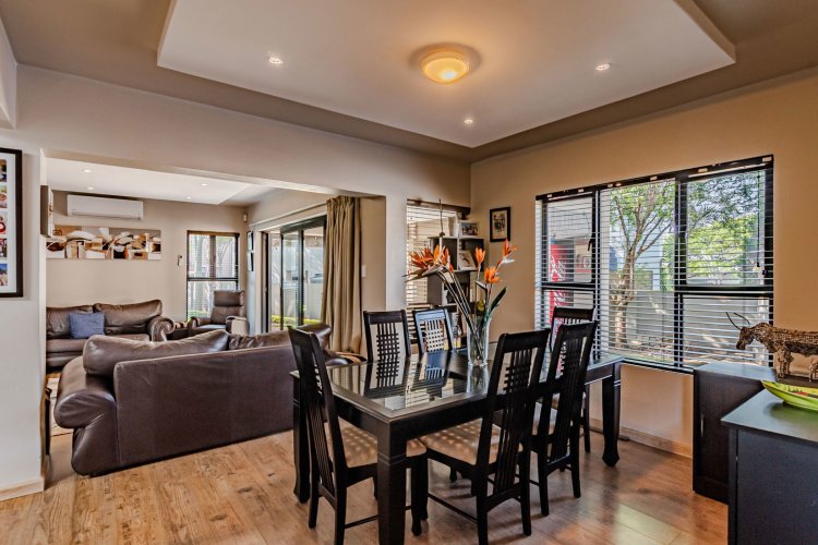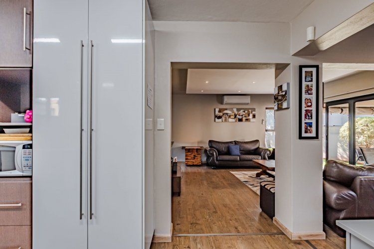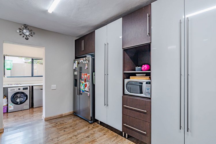 Exclusively presented. Tucked away in a peaceful corner, this immaculate home offers comfort, space, and a wonderful family lifestyle on a generous stand. The ground floor features open-plan living areas that flow seamlessly to the covered patio and sparkling pool — the perfect spot for relaxed entertaining around the built-in braai. The modern kitchen is beautifully finished and practical, complemented by scullery. A private study and guest bathroom complete the bottom floor of this neat family home. Upstairs, you'll find three spacious bedrooms, all en-suite and fitted with air conditioners for year-round comfort. The property also includes a separate helper's room with its own bathroom and a charming dollhouse that will delight the kids. Extras include extra size double garage, a storeroom and back-up solar.