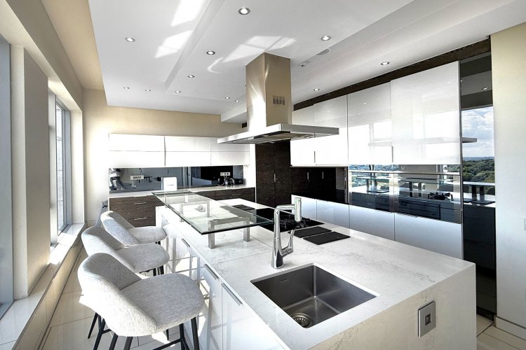 Top of the range Italian kitchen featuring sleek clean lines with bespoke cabinetry and central island ( eat in area) . Separate scullery.
