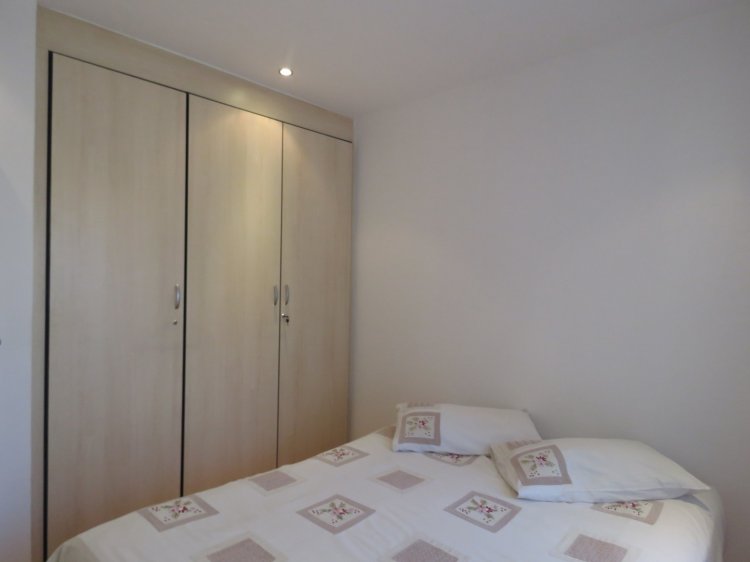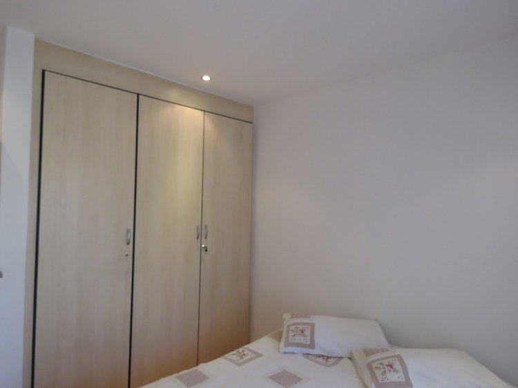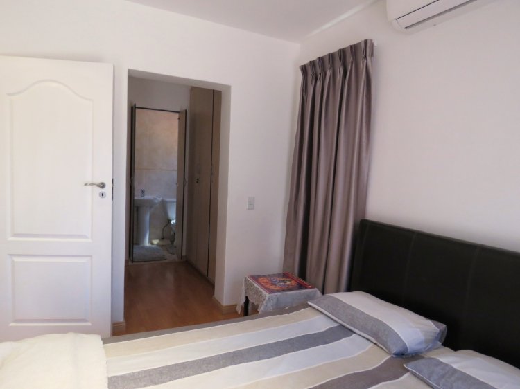 The apartment is fully tiled throughout and features a spacious main bedroom with air conditioning and an en-suite bathroom with toilet and shower. There is an additional bathroom with a shower, as well as a separate guest toilet. All bedrooms are fitted with built-in cupboards.