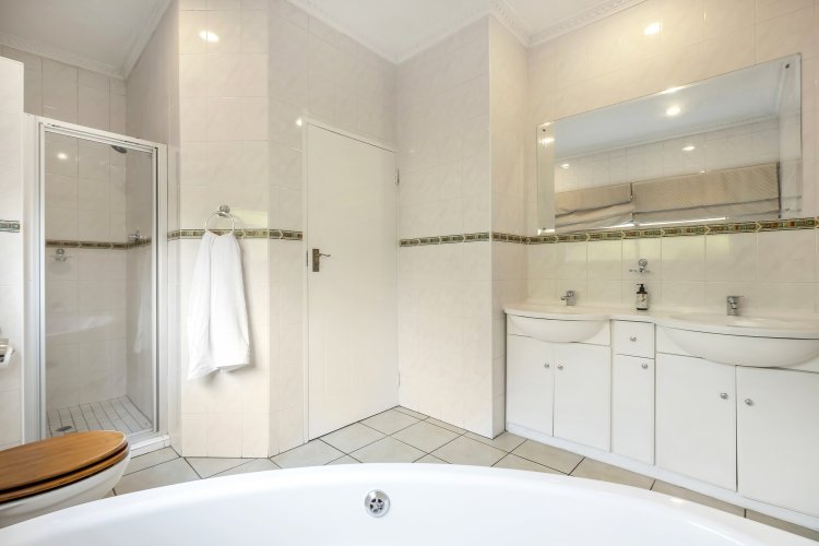 This home offers three generously sized bedrooms, all featuring laminated wooden flooring. The luxurious main bedroom includes a walk through dressing room to a spacious en-suite bathroom fitted with a corner bath, shower, double vanity with twin basins, and toilet. The two additional bedrooms share a modern, full family bathroom.