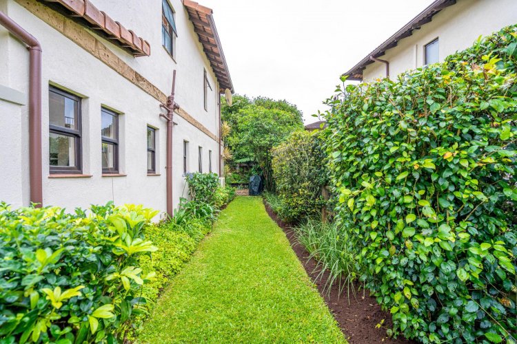 The kitchen is a chef's delight, boasting elegant granite countertops and ample storage. The unit offers two full bathrooms and a convenient guest restroom. Retreat to the main bedroom, which features its own private patio, a peaceful haven overlooking a meticulously maintained garden. The second bedroom also opens onto a patio, offering a lovely spot to enjoy your morning coffee.