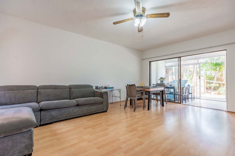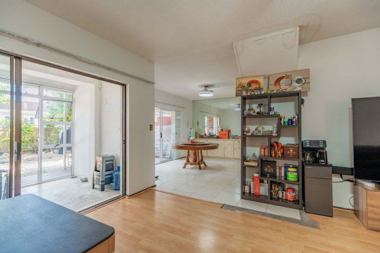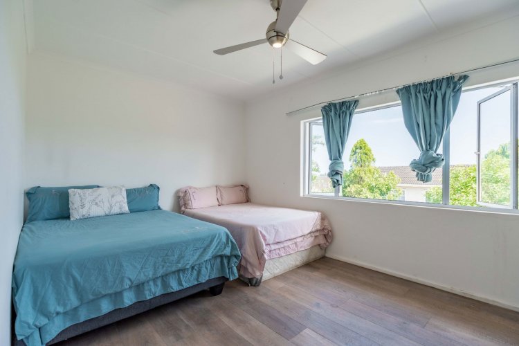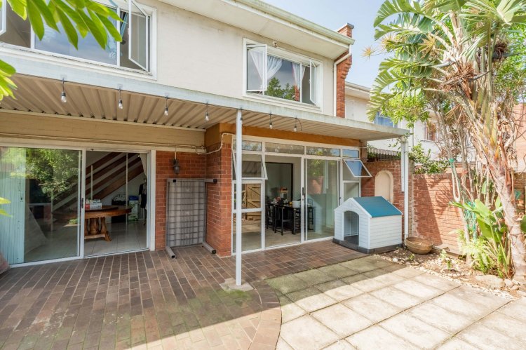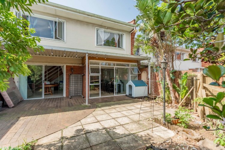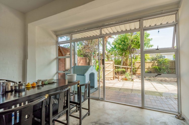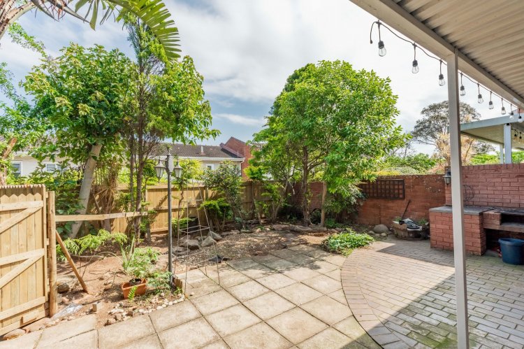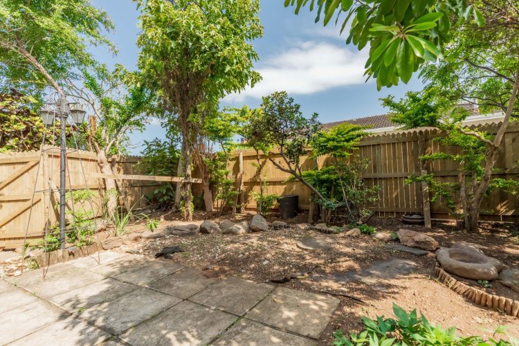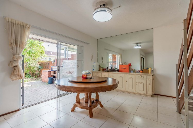 The property features three spacious bedrooms and two bathrooms, all conveniently located upstairs. The living area boasts an open-plan lounge that flows into an enclosed patio, providing a lovely space to relax while overlooking the tranquil garden. The dining area opens onto the garden through sliding doors, creating seamless indoor-outdoor living.