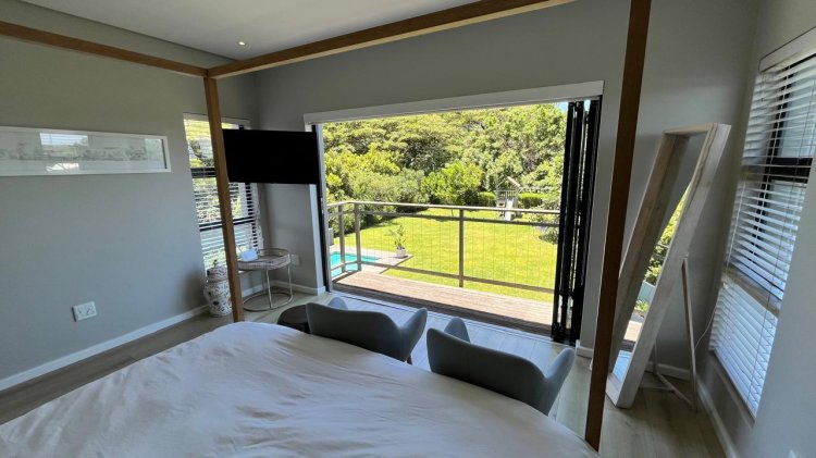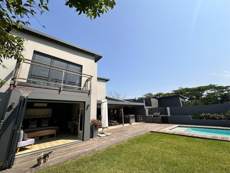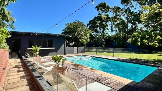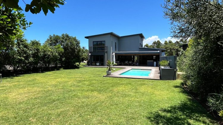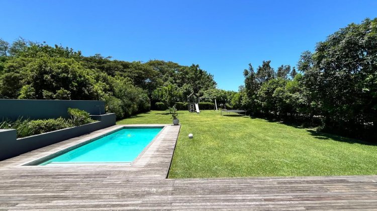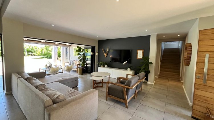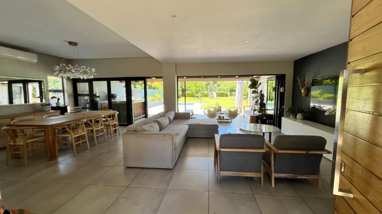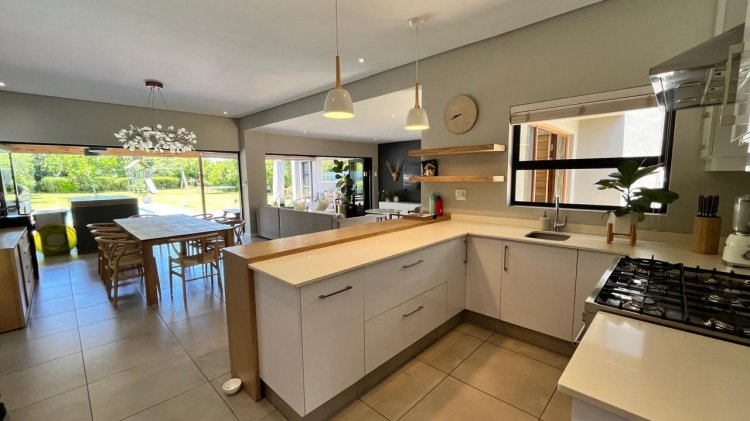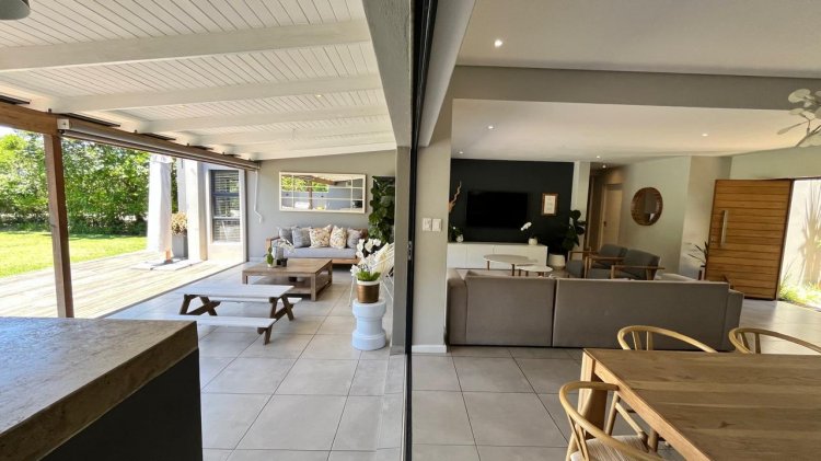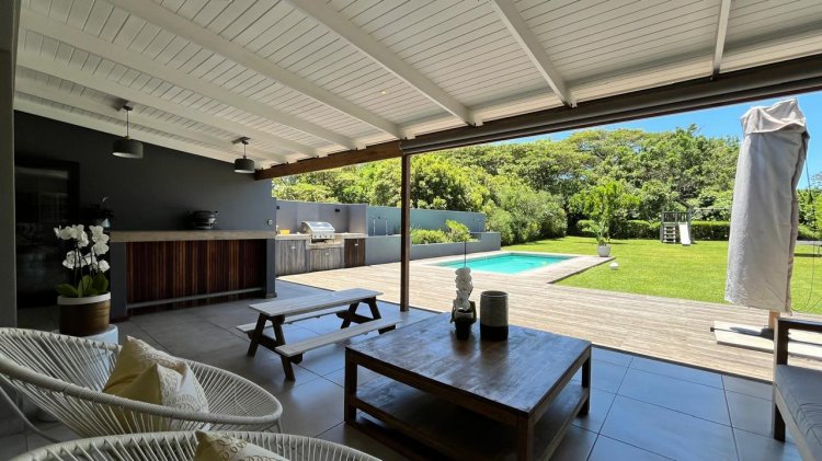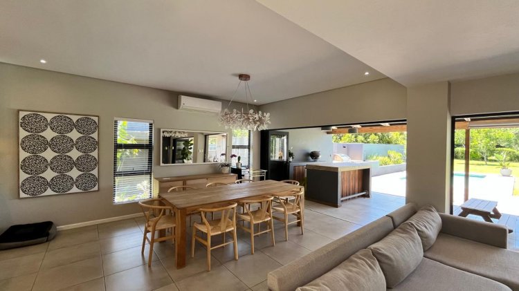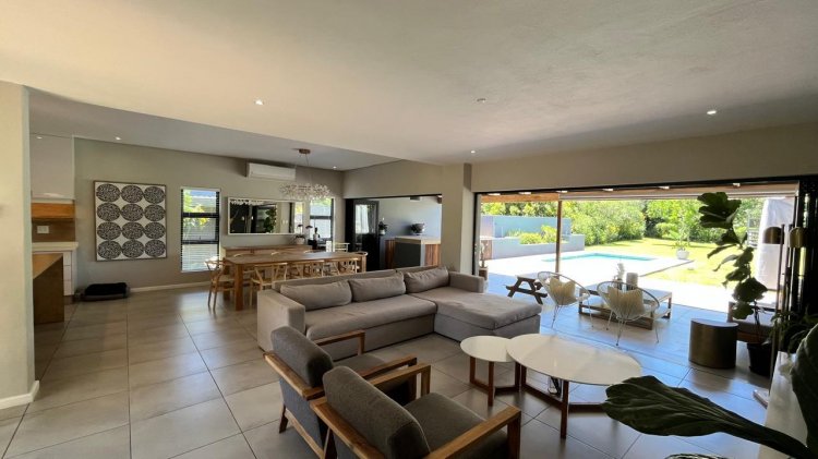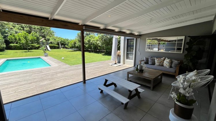 The open-plan design flows effortlessly from the indoors to a large covered patio overlooking a spacious garden, sparkling pool, built-in braai, and bar area—ideal for summer gatherings or lazy weekends.