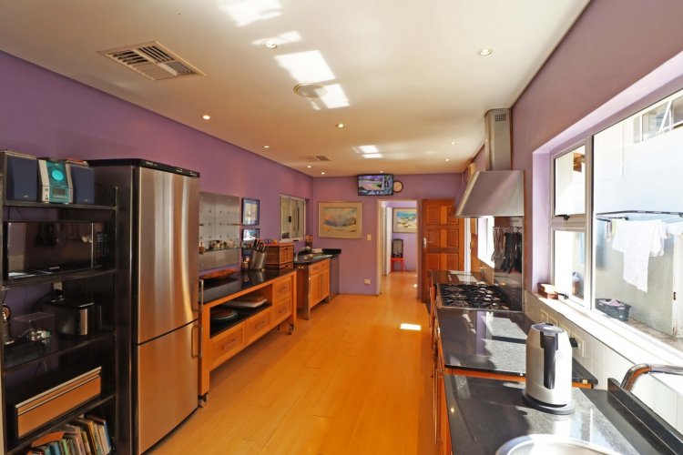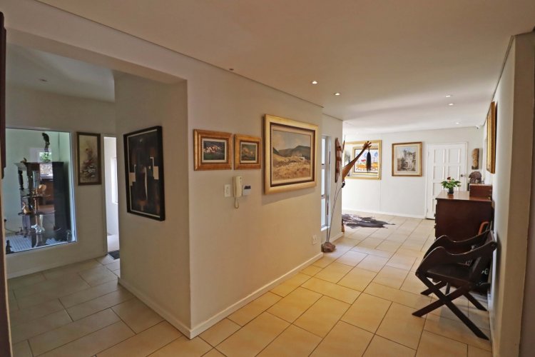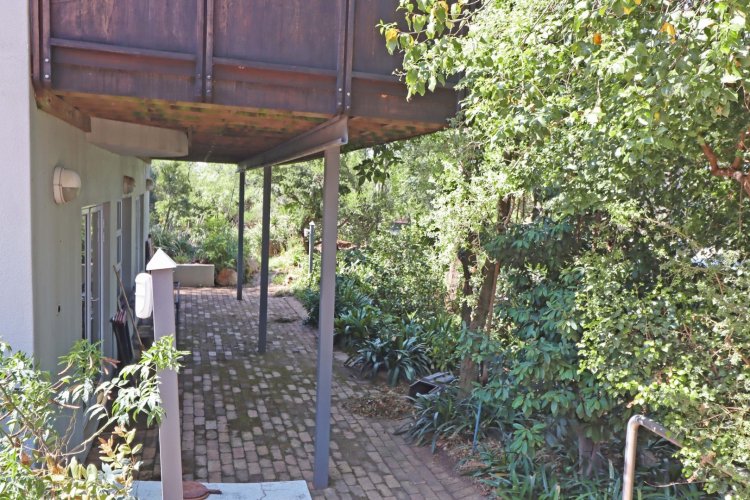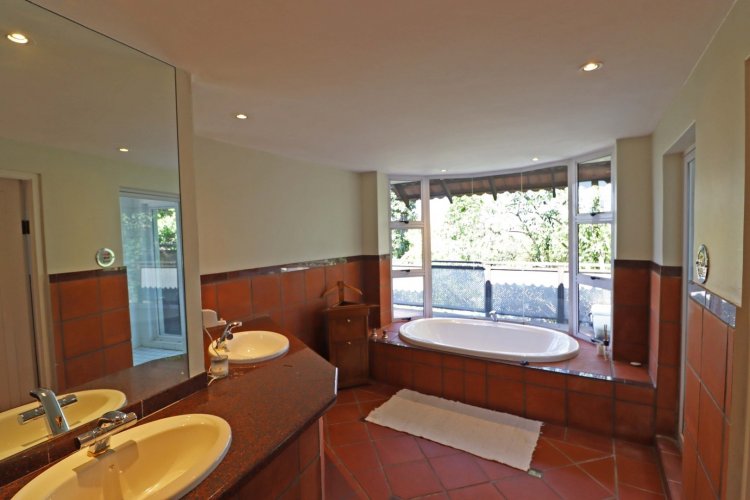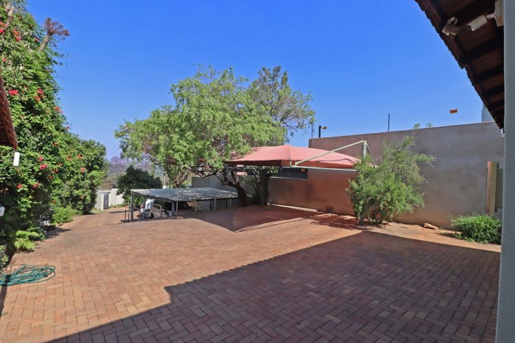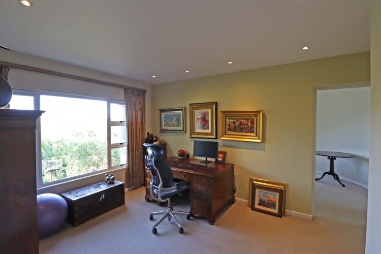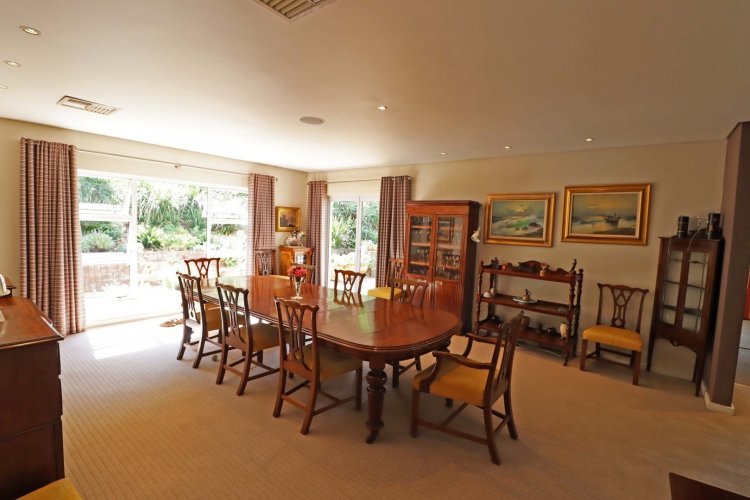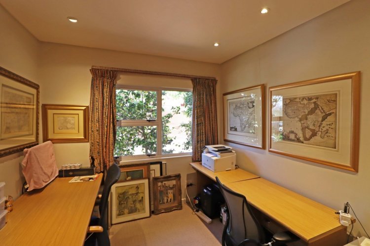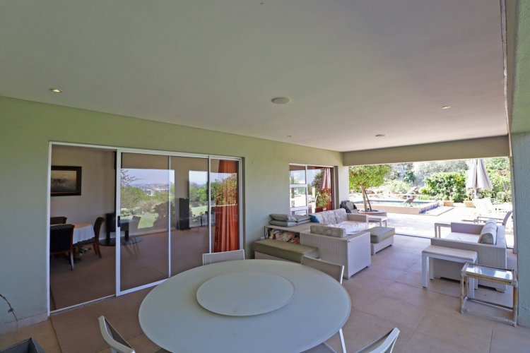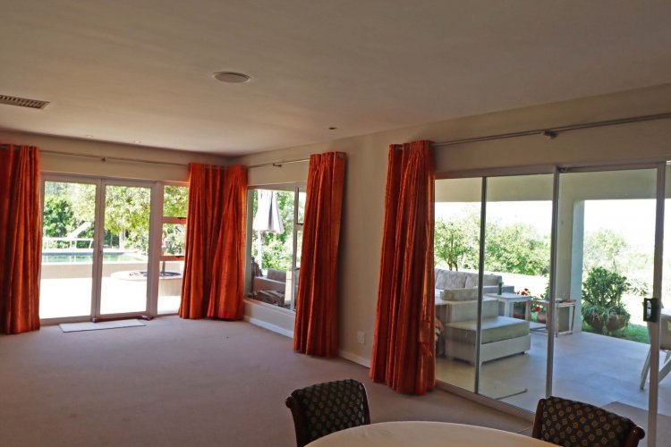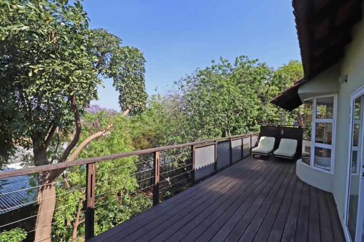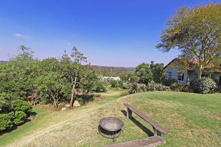 The kitchen has a gas hob and separate scullery/laundry with pantry. Large dining room leads onto two lounges with fireplace and out onto a large, covered patio with uninterrupted views of Sandton.