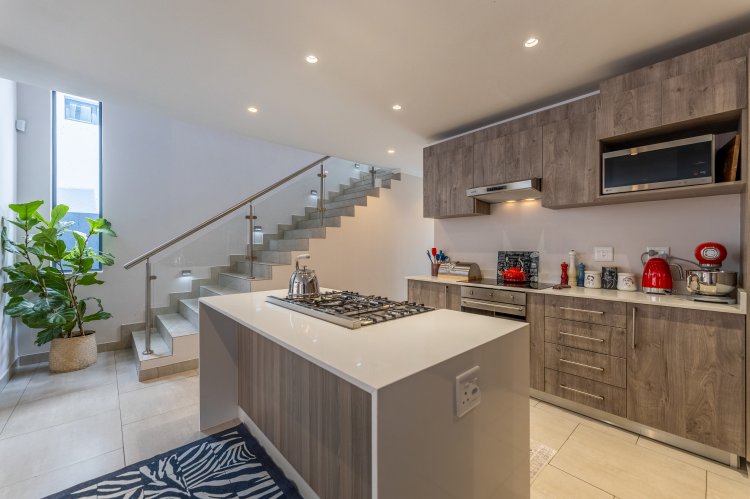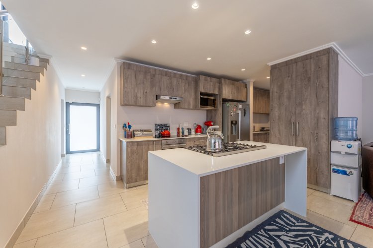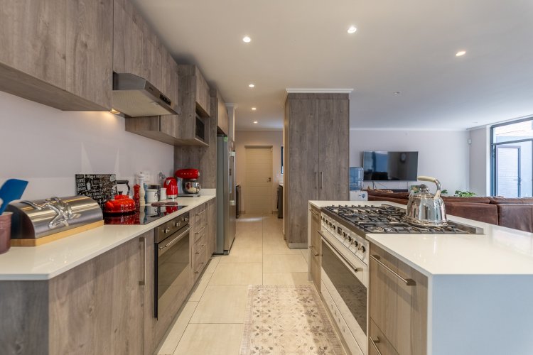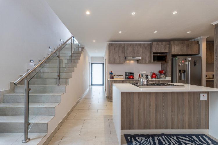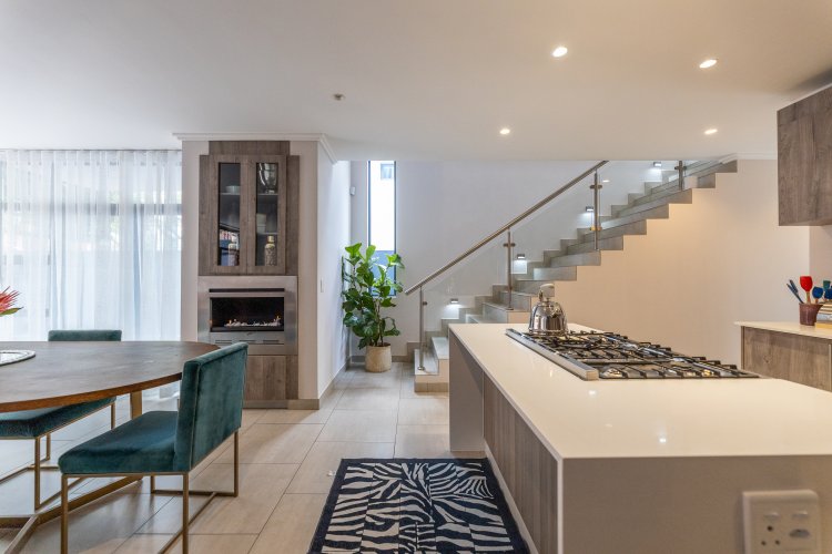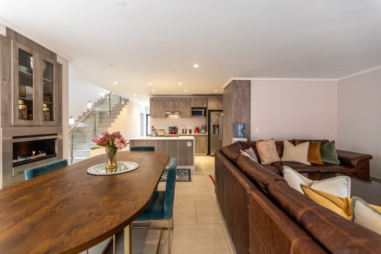 Interior Features Include: • Sleek porcelain tiling throughout • Fully fitted modern kitchen with stone countertops, a central island featuring a gas hob, and a separate electric stove • Scullery with space for three appliances • Premium SMEG oven, hob, and extractor • Spacious open-plan lounge and dining area with a built-in gas fireplace • Guest cloakroom • Seamless indoor-outdoor flow to open decked patios, finished with elegant glass balustrades and a built-in braai, perfect for entertaining