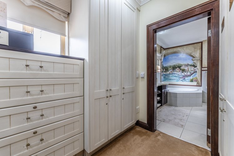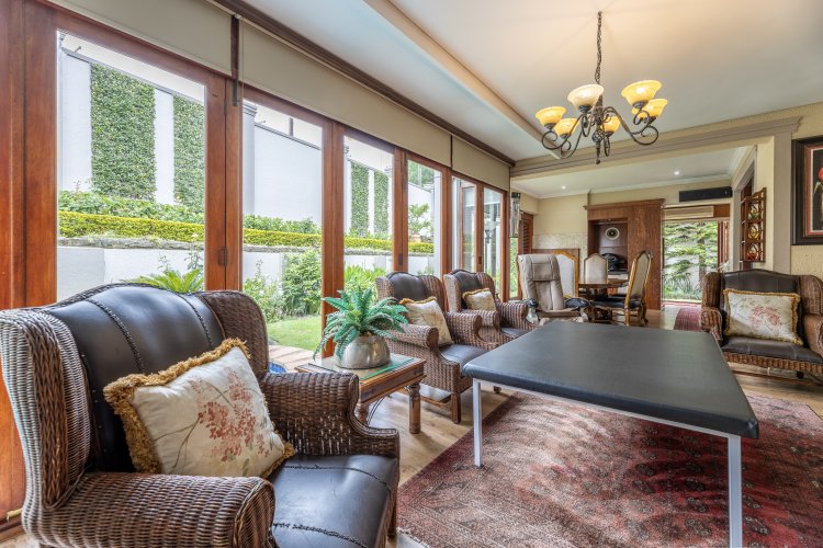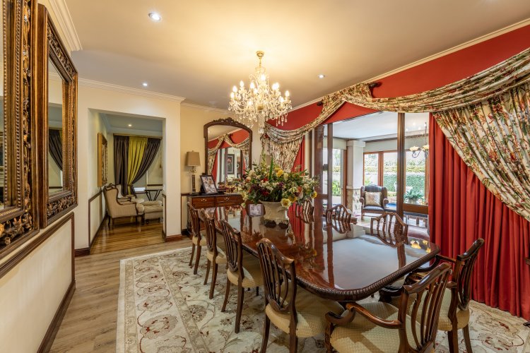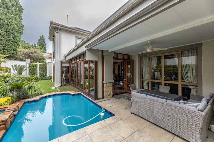 Receptions consist of a welcoming double volume entrance hall, a study / home office with a separate entrance, a formal lounge with a gas fireplace & TV /family room. Beautifully decorated kitchen with an island and a large scullery & laundry. Entertainers’ patio, enclosed with wooden stacking doors featuring magnificent wooden cabinetry, bar, braai and built-in fridges. Stunning manicured & landscaped garden with automated irrigation & a splash pool.