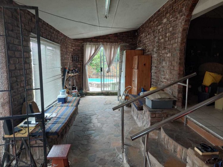 The original prefab long davels (rondavels) have been bricked in and therefore some tweaking is required to make this property suitable to yourselves. The property is spacious and the bedrooms are light and sunny. The cupboards are all freestanding. There are 2 lounge dining areas as well as a lovely enclosed verandah area which opens up onto a stunning splash pool and braai area. There is also an indoor built in braai.