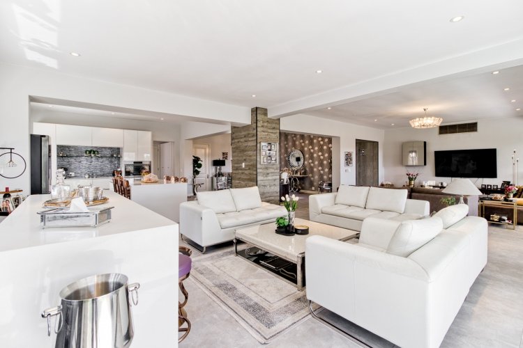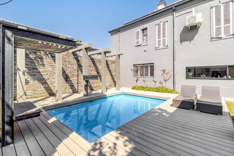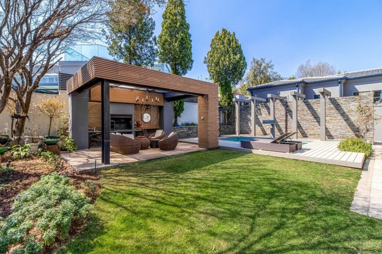 The kitchen is a masterpiece of modern design, featuring integrated appliances that will delight any chef. It seamlessly connects to the open-plan dining area and living space, complemented by a well-appointed bar for effortless entertainment. The outdoor patio is an entertainer's paradise, complete with a pergola overlooking a sparkling pool and meticulously landscaped garden.