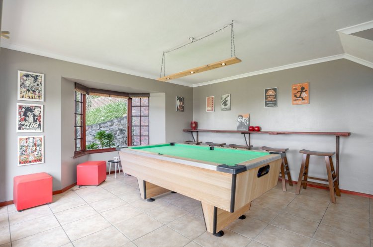 Designed for easy living and entertaining, it features an open-plan layout flowing to a private outdoor area with a built-in pizza oven, braai, and firepit — the perfect setting for relaxed gatherings. The spacious kitchen includes a scullery, and the home also boasts a TV lounge and a games room that opens directly to the garden and sparkling pool.