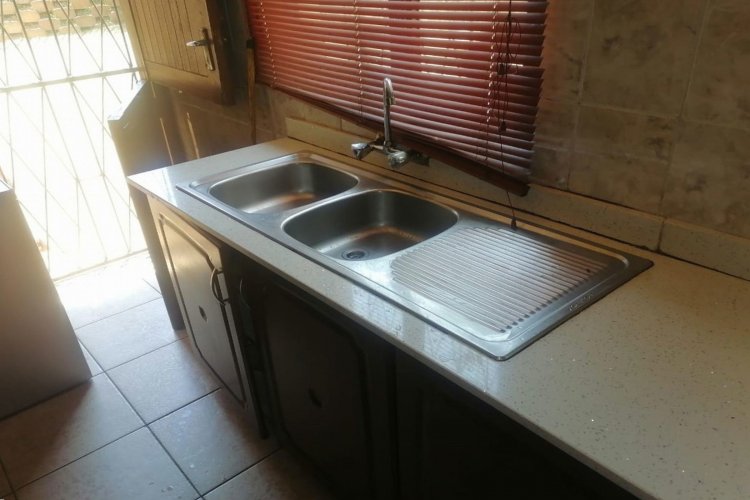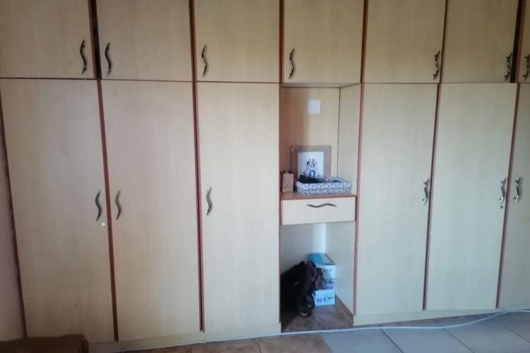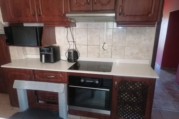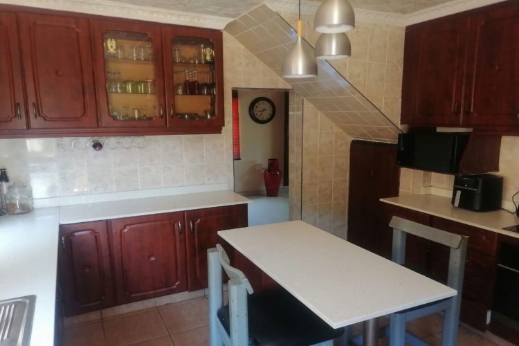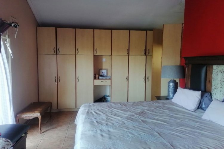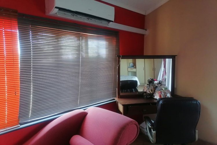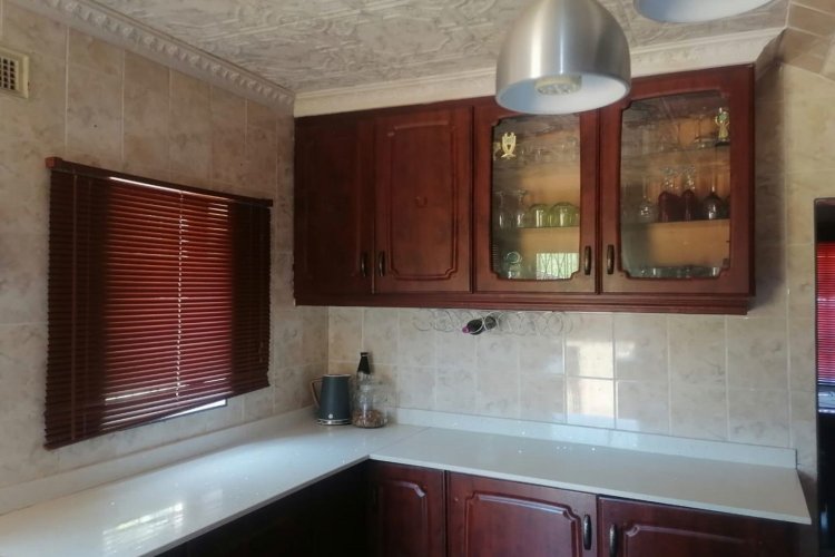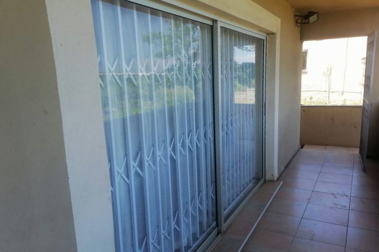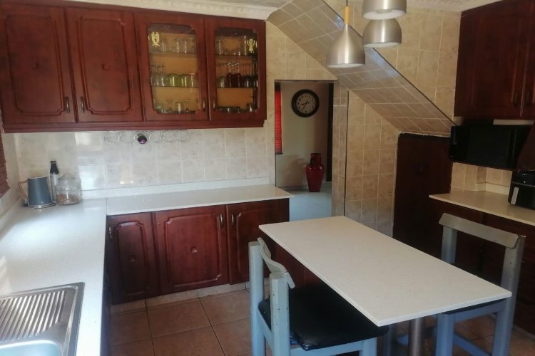 The property features tiled flooring throughout and kitchen with granite countertops. The open-plan living area includes sliding doors that enhance natural light, while the main bedroom offers air conditioning for added comfort. For security, the home is equipped with an alarm system, security gates, and burglar bars.