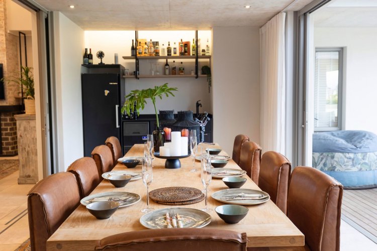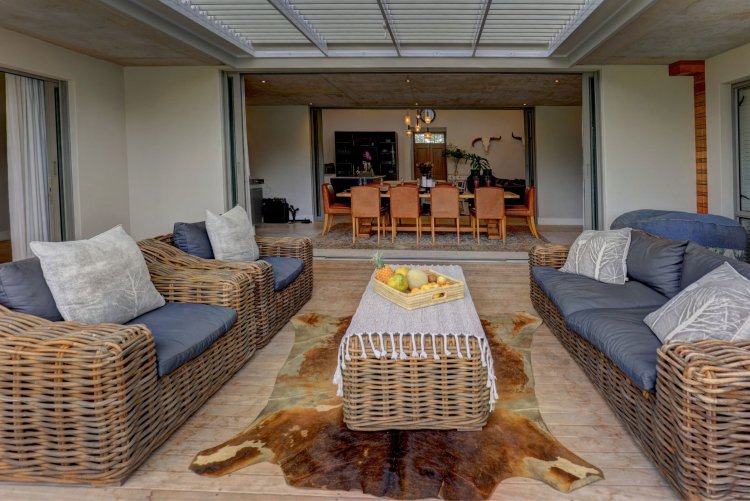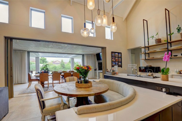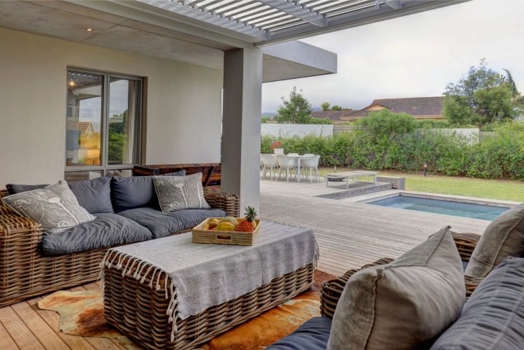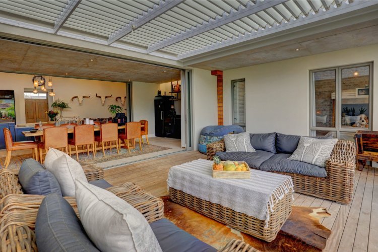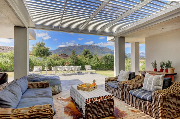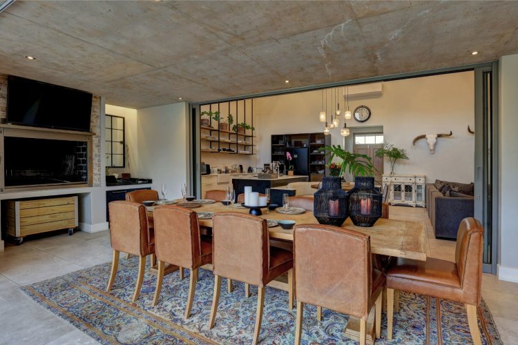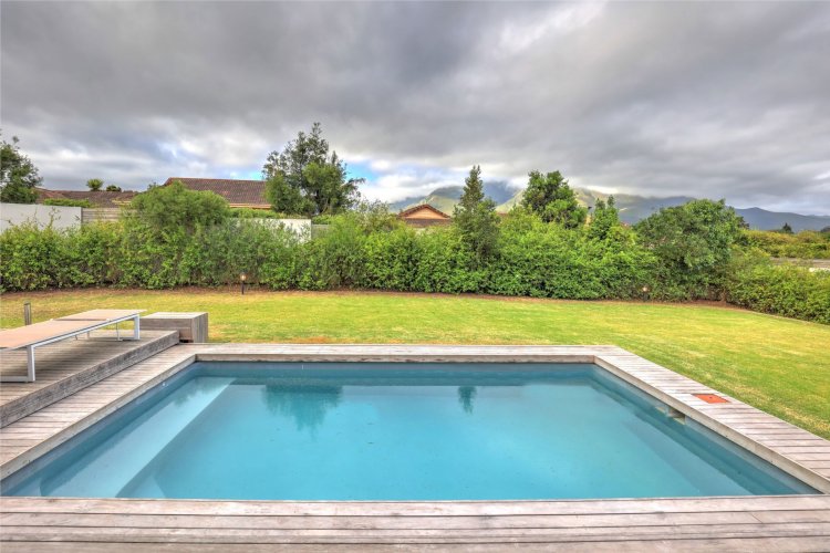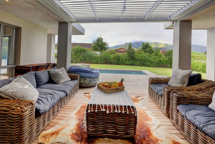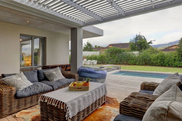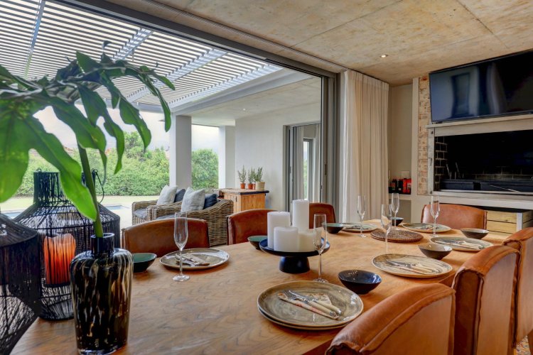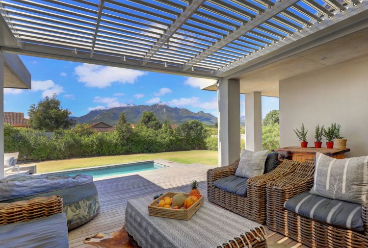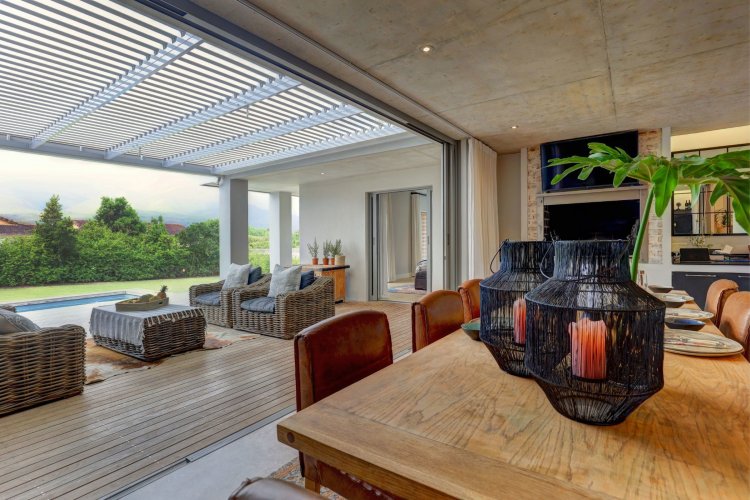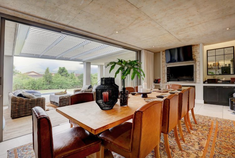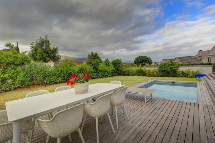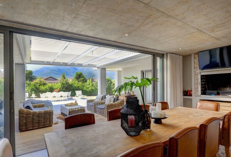 Open plan living that extends from the kitchen and living area to the indoor braai/dining area and out to the louvred patio, overlooking the decked pool, spacious garden and the mountain as a backdrop