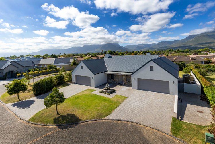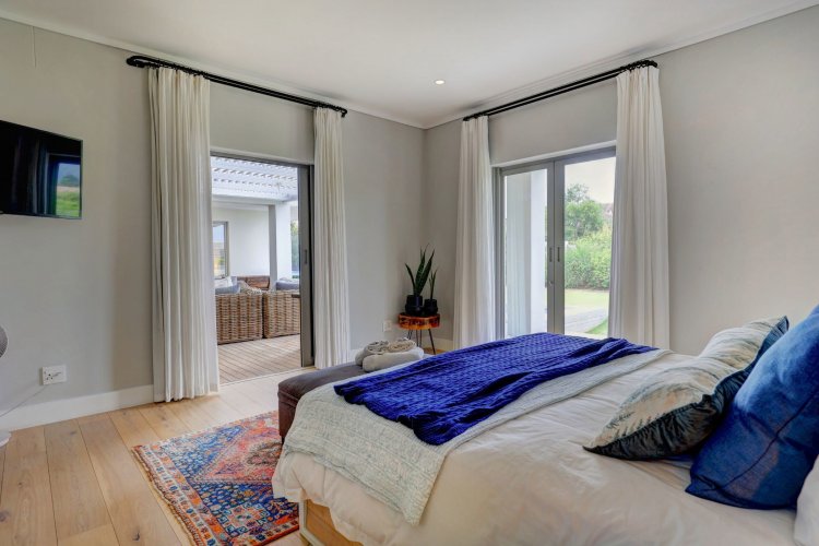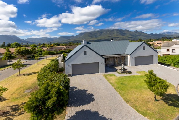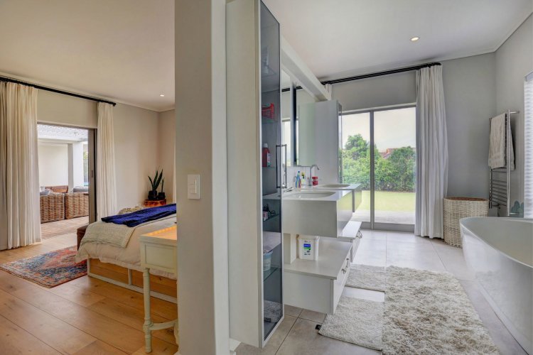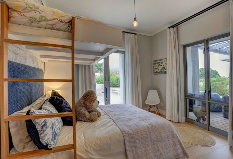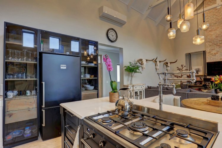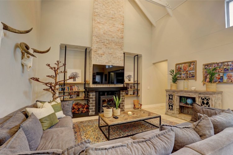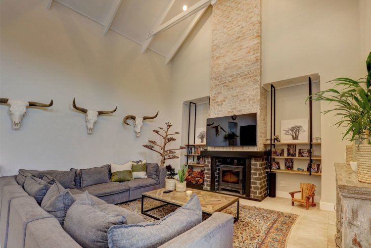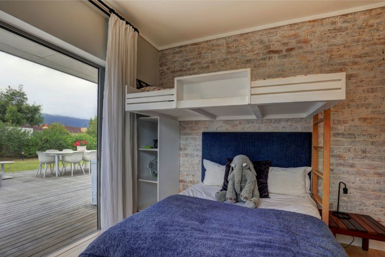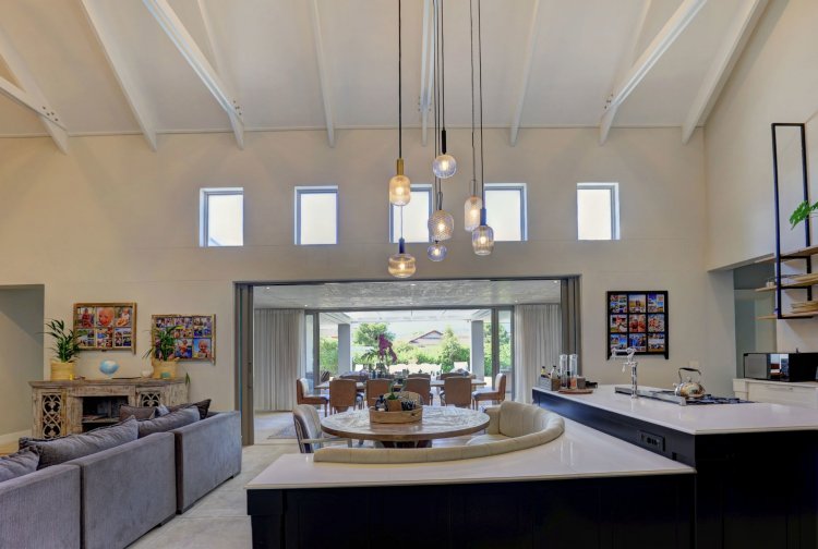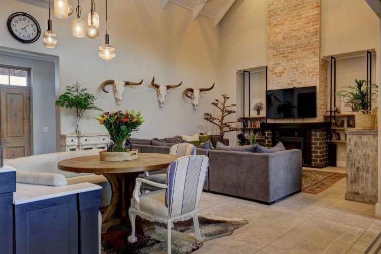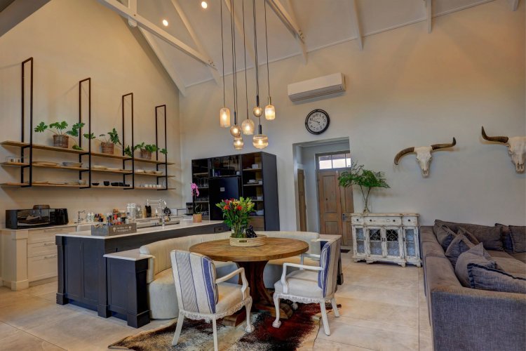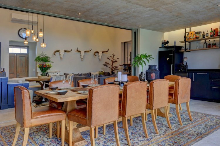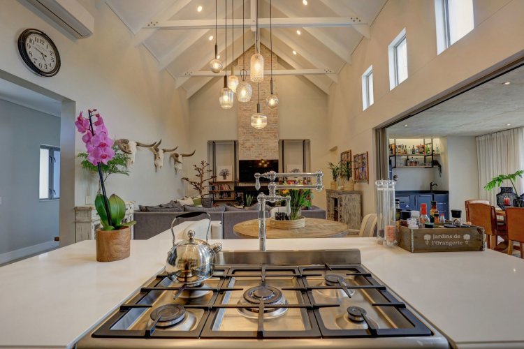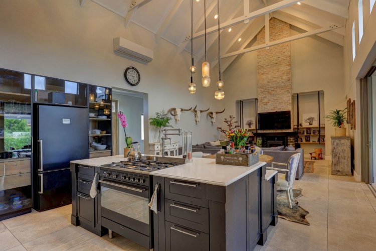 Open plan living that extends from the kitchen and living area to the indoor braai/dining area and out to the louvred patio, overlooking the decked pool, spacious garden and the mountain as a backdrop