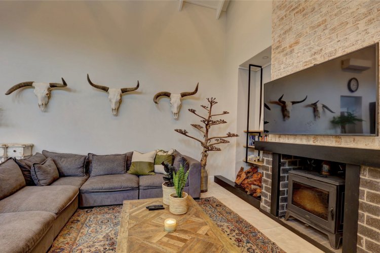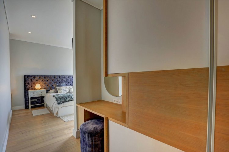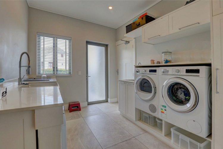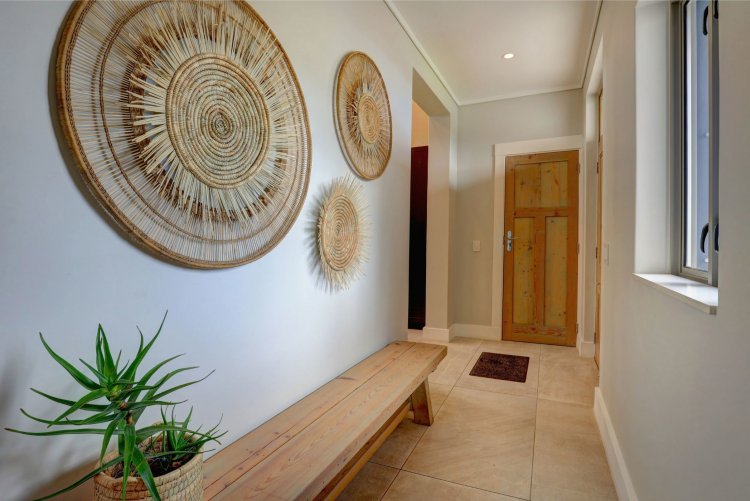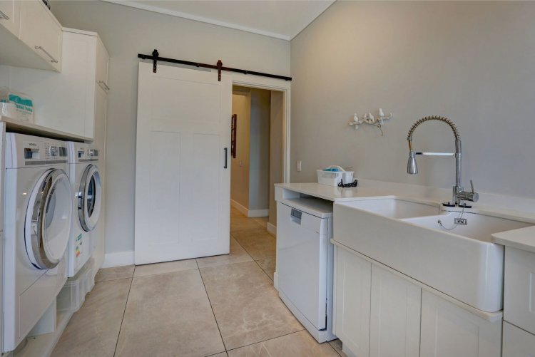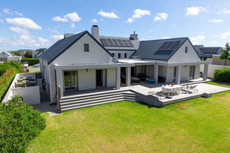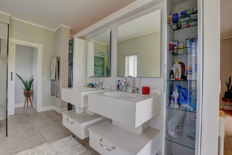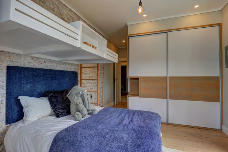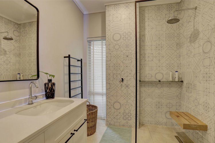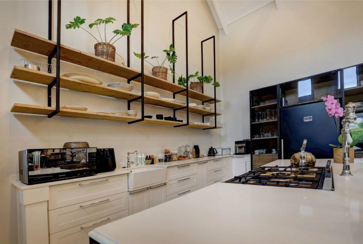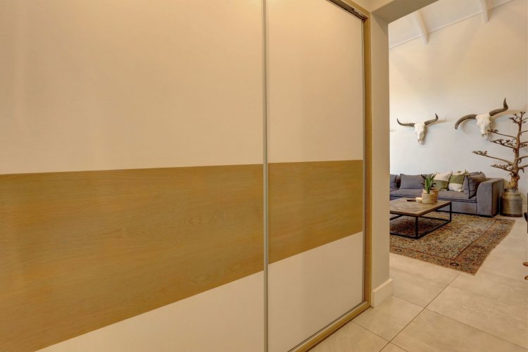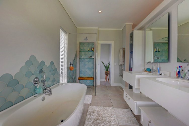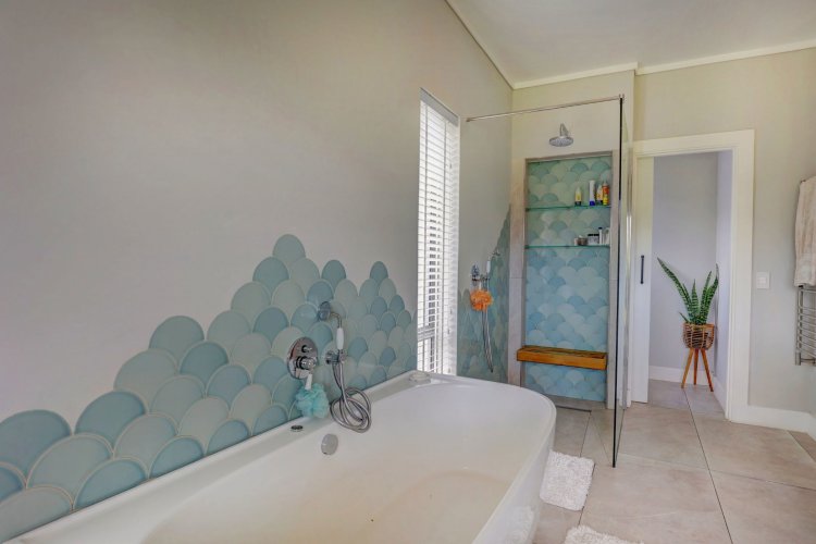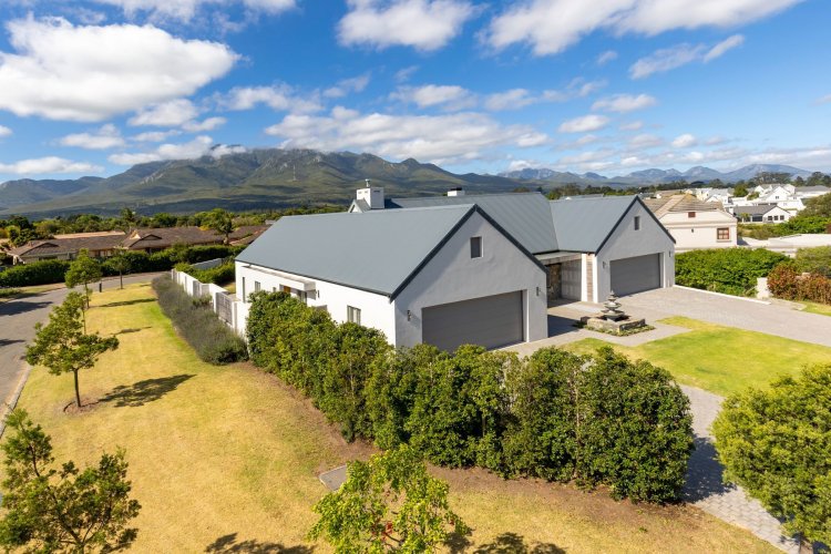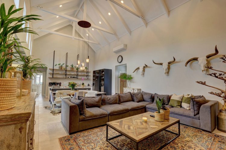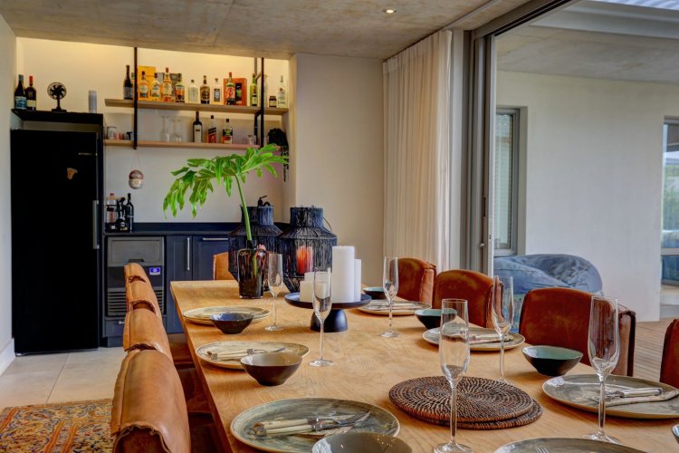 Open plan living that extends from the kitchen and living area to the indoor braai/dining area and out to the louvred patio, overlooking the decked pool, spacious garden and the mountain as a backdrop