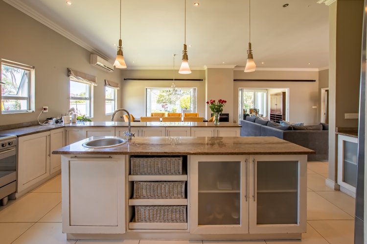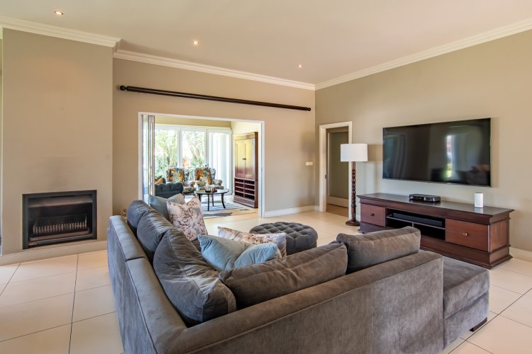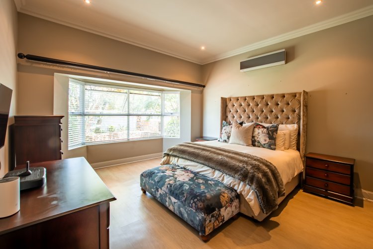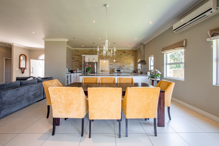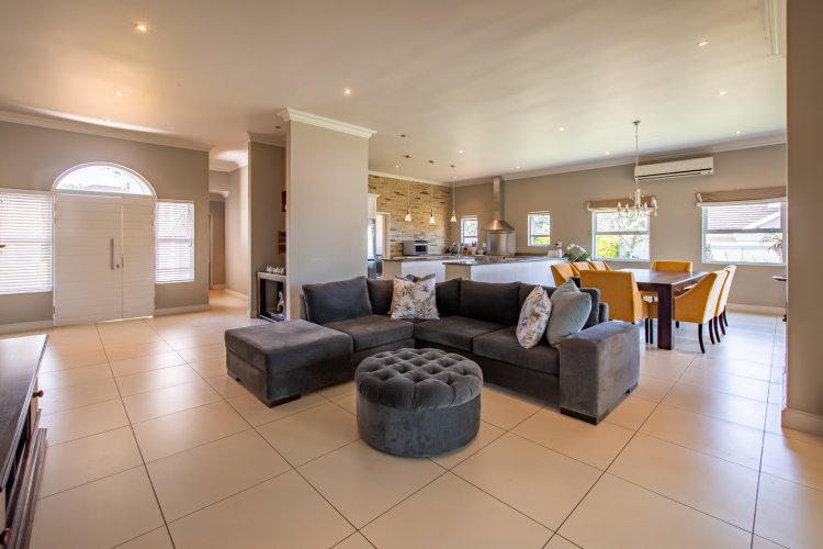 Set in one of the Upper Highway’s most desirable and well-secured residential estates, this refined family residence in Langford Country Estate delivers an exceptional combination of generous proportions, comfortable living and everyday practicality. Ideally positioned in Montague an easy stroll to the estate entrance, the property benefits from convenient access, a key advantage for families with busy schedules. Measuring approximately 352m² under roof, the home has been carefully planned to suit contemporary lifestyles while offering seamless indoor/outdoor entertaining. Spacious open-plan living areas form the core of the home, flowing effortlessly onto a covered patio that invites relaxed gatherings. The kitchen is a stylish yet practical focal point, designed to encourage family interaction while connecting smoothly to the dining and living spaces. Aluminium concertina doors open onto an inviting entertainment area featuring a built-in braai and firepit creating the perfect setting for social evenings. The exterior space is a true highlight, boasting a rare, level garden ideal for children and pets, along with a sparkling swimming pool enhanced by a water feature. Added conveniences include a 5 000-litre water tank, additional parking and a double garage. Inside the home offers a cohesive and comfortable finish with tiled living areas, laminate flooring in the bedrooms, high ceilings and air-conditioning throughout. Accommodation comprises four generously sized bedrooms, with the upstairs bedroom offering privacy and its own en-suite bathroom, an excellent option for guests, teenagers or a secluded main suite.