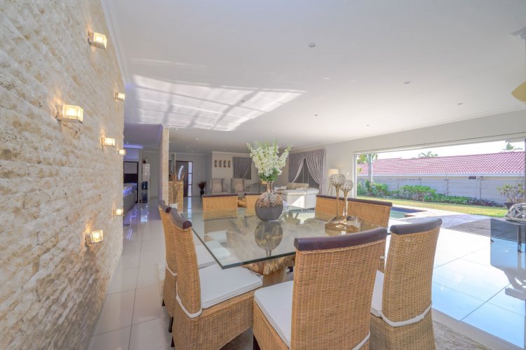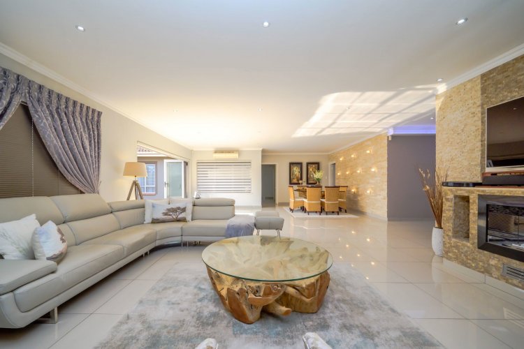 The home boasts a massive formal lounge with a cozy fireplace, complemented by an additional lounge and dining area that seamlessly flow through stacking doors onto the sparkling swimming pool and manicured garden – the perfect blend of indoor and outdoor living.